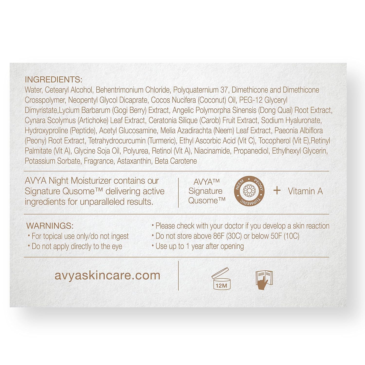 - ADVANCED SCIENCE + AYURVEDICS: AVYA Signature Qusome boosts radiance and texture with botanical blends containing peony, turmeric and neem.