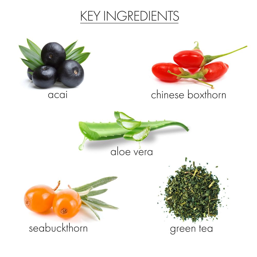 • CLARIFIES: The appearance of UV damaged skin is reduced by organic green tea and chinese boxthorn