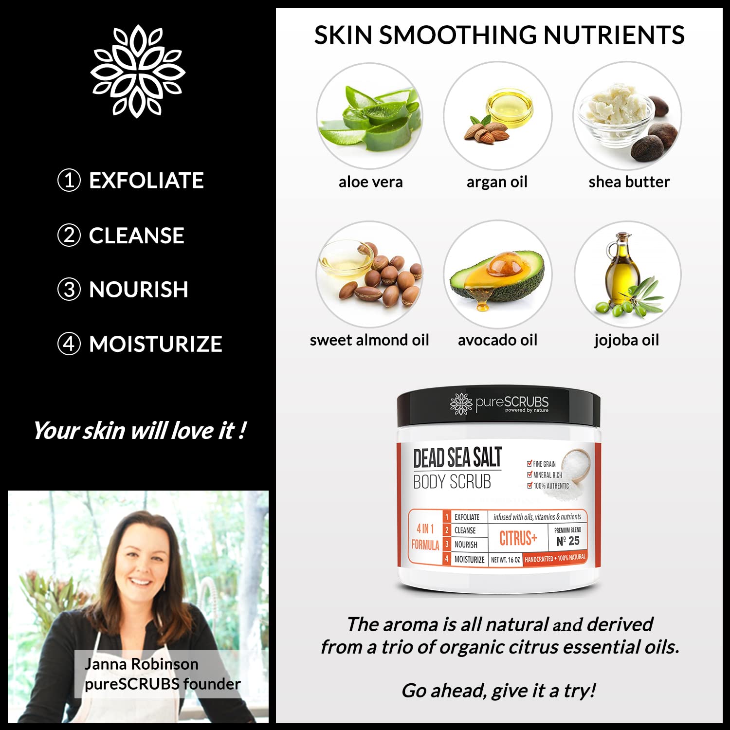 • GET ULTRA SMOOTH SKIN FAST - THIS WORKS! Our unique “4 in 1 Formula” does everything a body scrub should do and more - EXFOLIATE, CLEANSE, NOURISH & MOISTURIZE. Fine grain dead sea salt infused with essential oils, nutrients and skin softeners helps to smooth away rough, bumpy, and uneven textures to instantly reveal your true soft, healthy and radiant skin. You'll love the citrus aroma!
