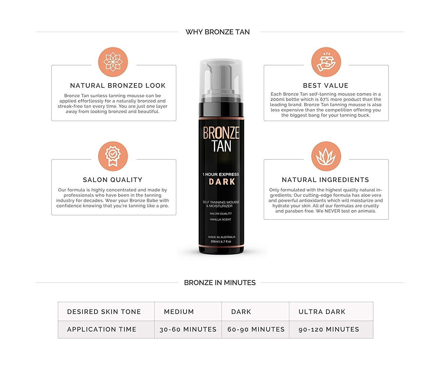 • Natural Ingredients - Our sunless tanning mousse is formulated with only the highest quality natural ingredients. Our cutting edge formula will moisturize and hydrate your skin while giving you a flawless tan.
