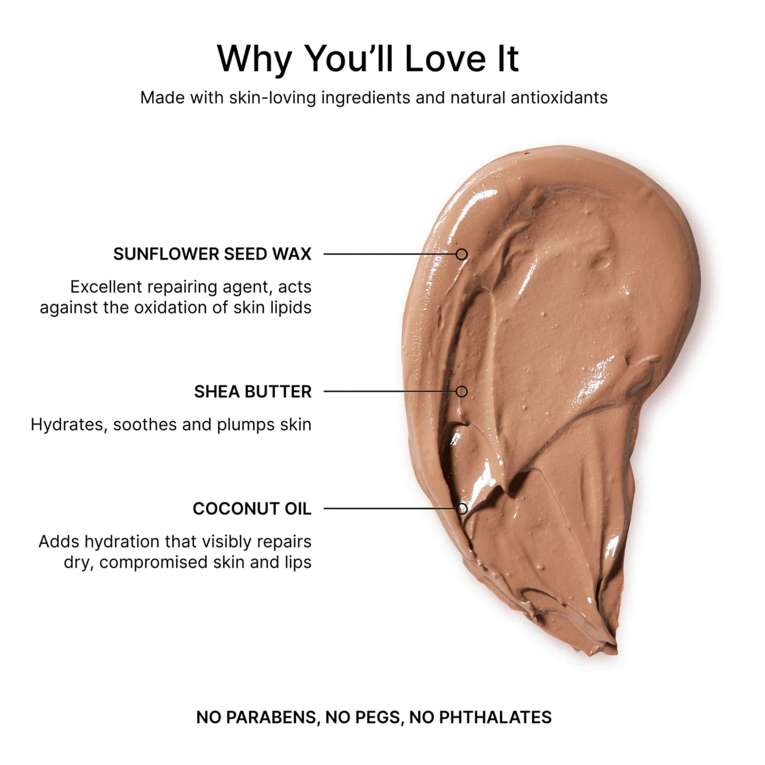 - SKIN LOVING. Loaded with skin loving ingredients such as organic sunflower seed oil, organic coconut oil, nourishing shea butter, and natural antioxidants. Made without parabens, sulfates, phthalates, petrochemicals, and GMOs. Clean Beauty.