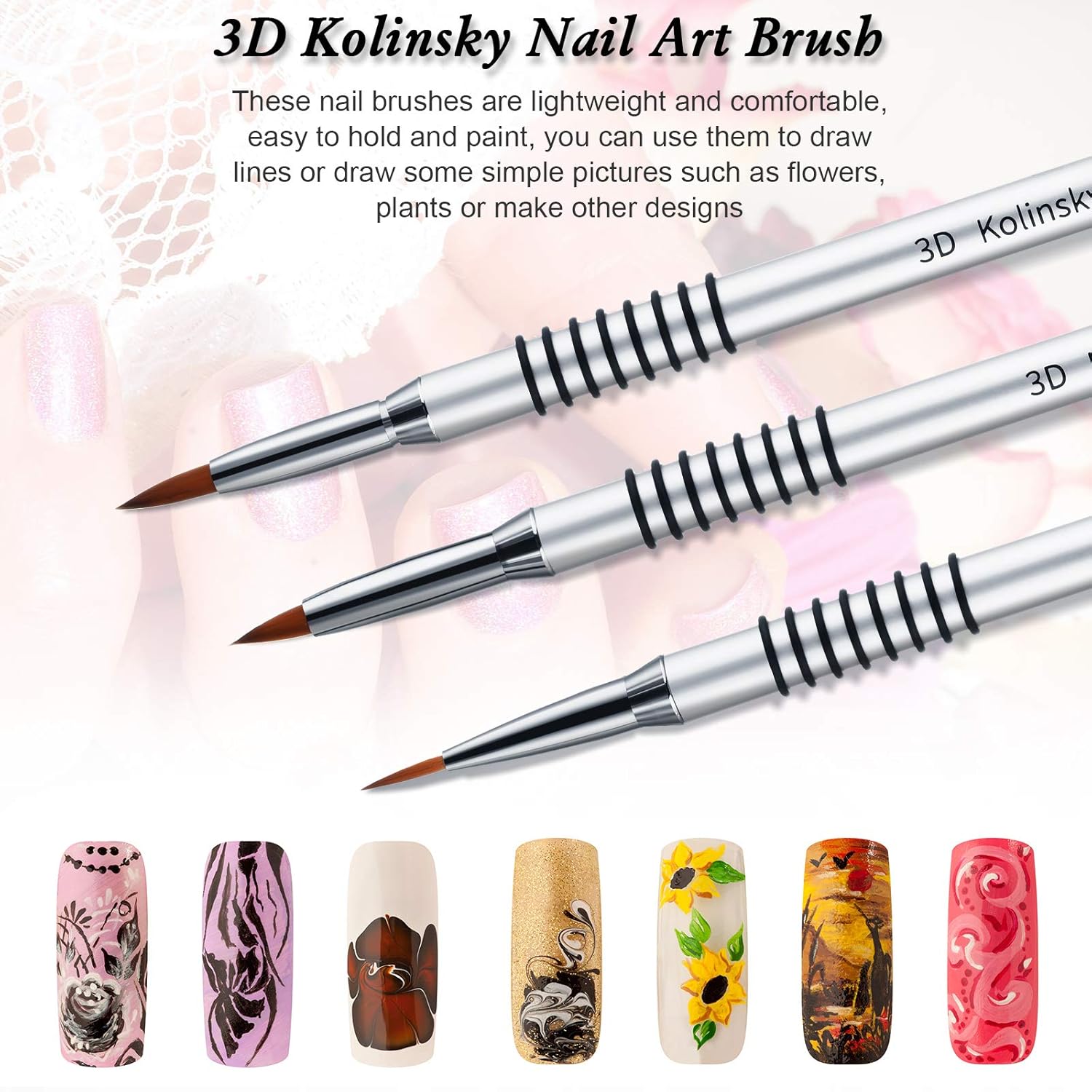 Patelai 3 Pcs Kolinsky 3D Nail Art Brush Set Size 2/4/5 Acrylic Nail Art Brush with Silver Metal Nonslip Grip Handle Polish Cleaning Manicure Tools for Women Acrylic Sculpture Application