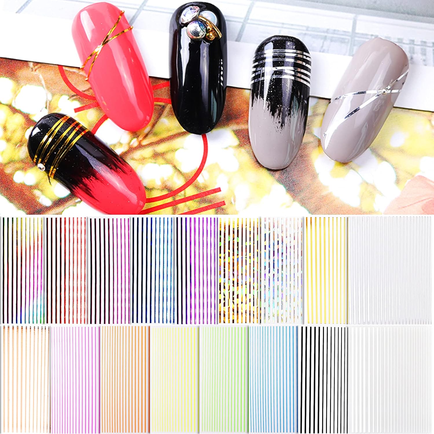 - ăPackage ContainsăYou will receive 17 Sheets different colorful self-adhesive strip line nails stickers, which can offer you multiple choices and meet your needs. You can design any nails art as you like.