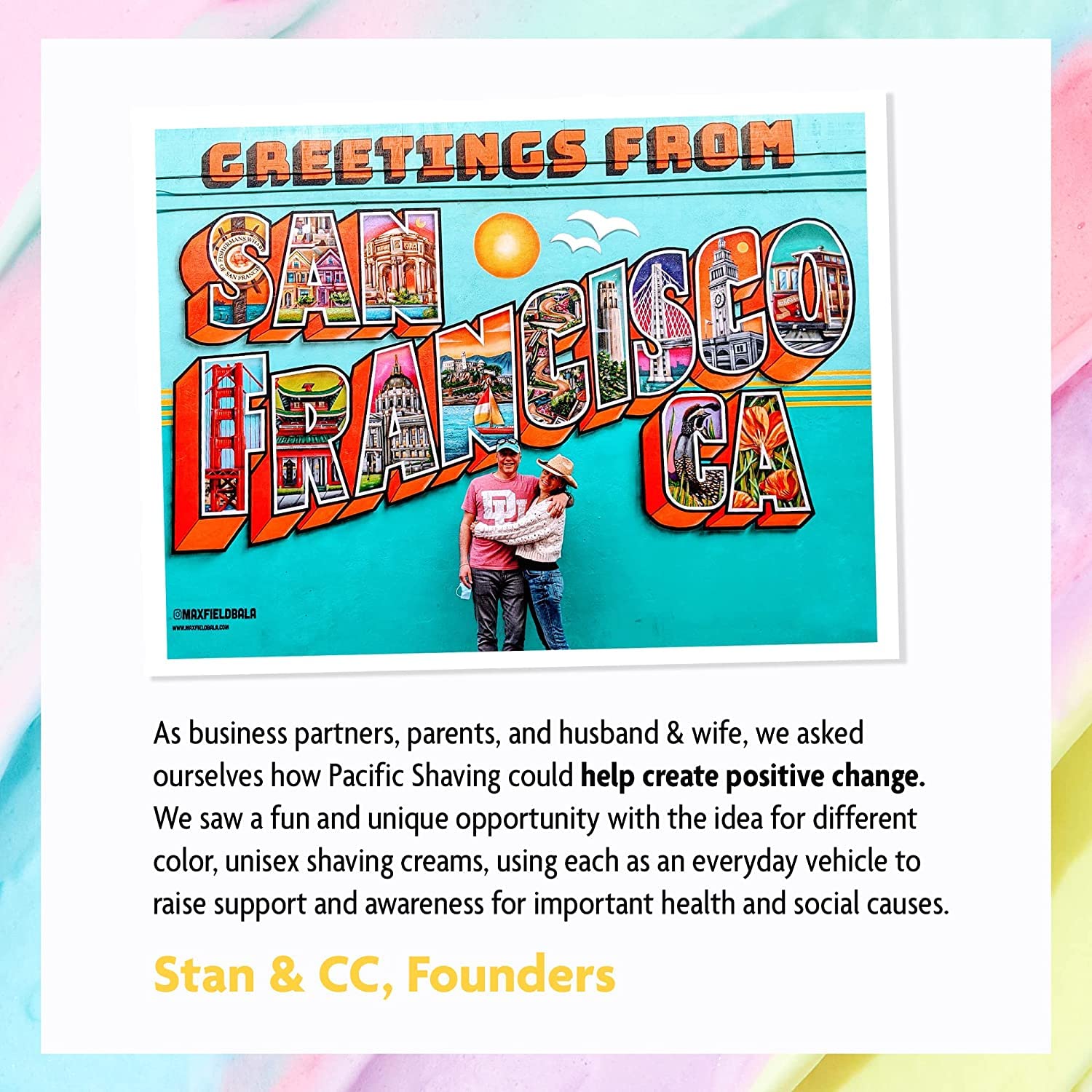- Shave with Purpose - As business partners, parents, and husband & wife, we asked ourselves how Pacific Shaving could help create positive change beyond just superb shaving cream for men. We saw a fun and unique opportunity with the idea for different color unisex shaving cream women and men would love. Oh, and did we mention they make great sensitive skin shaving cream?