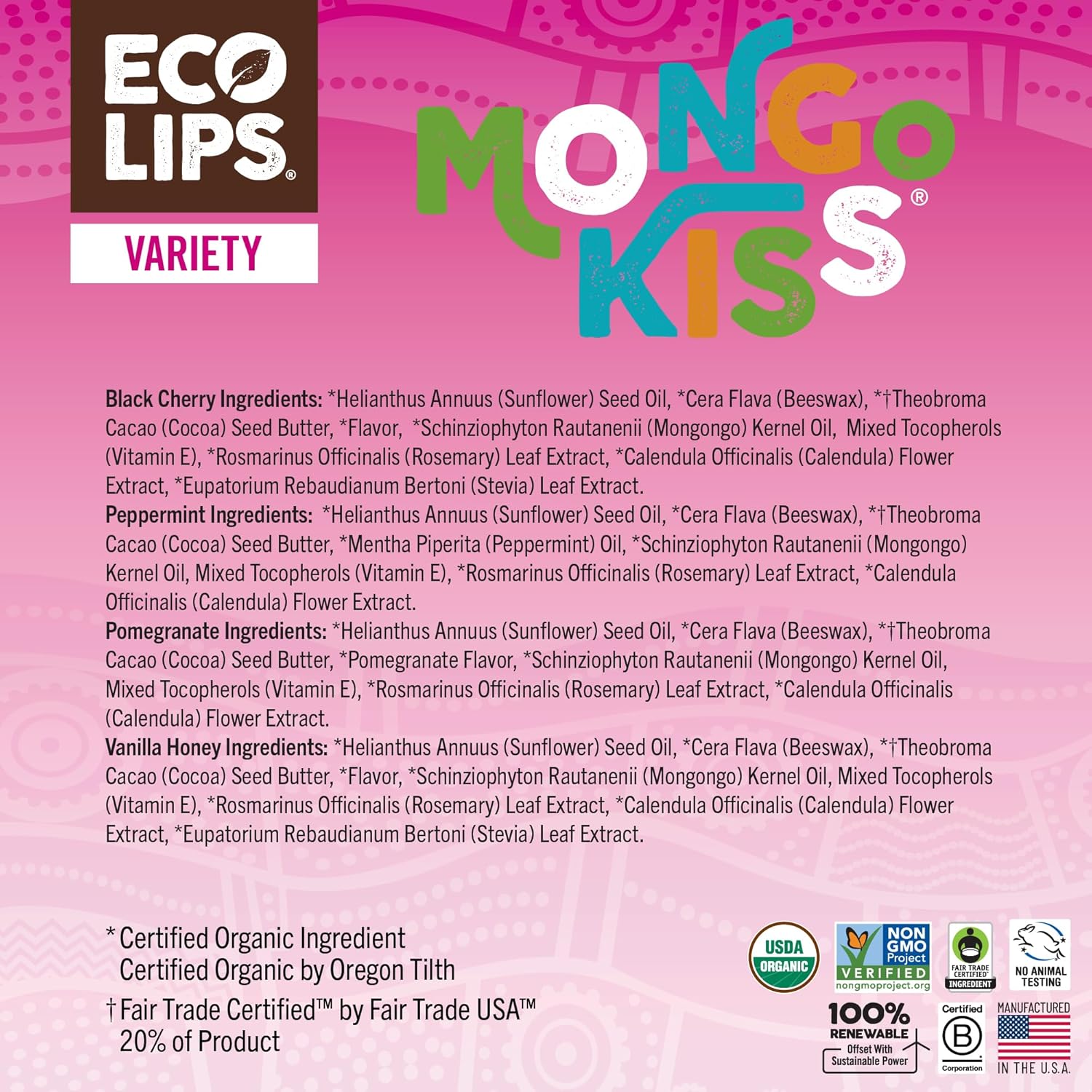 Eco Lips Mongo Kiss Organic Lip Balm 4 Pack Peppermint, Pomegranate, Vanilla Honey, Black Cherry - 100 Percent USDA Organic - Soothe, Moisturize Dry, Cracked and Chapped Lips - Made in USA
