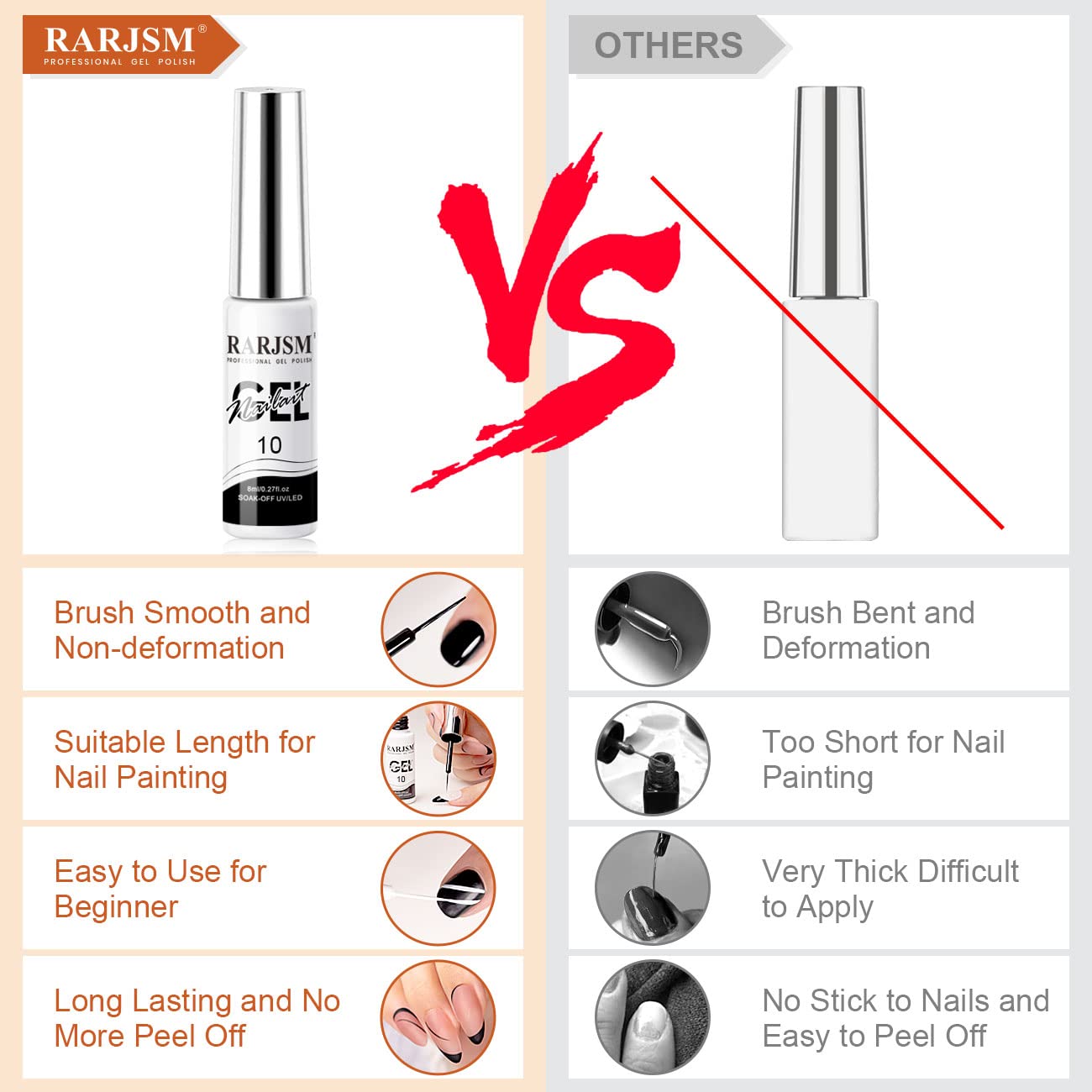 - SMOOTH FORMULA:RARJSM soak off nail art gel is made of smooth formula and the brush is slim and sharp to draw any pattern.This painted gel nail polish is easy to hand painted,drawing flowers,sumi,pull the line,dotting,striping,etc.These features can help us to get nail art like geometric nails,french manicure nails