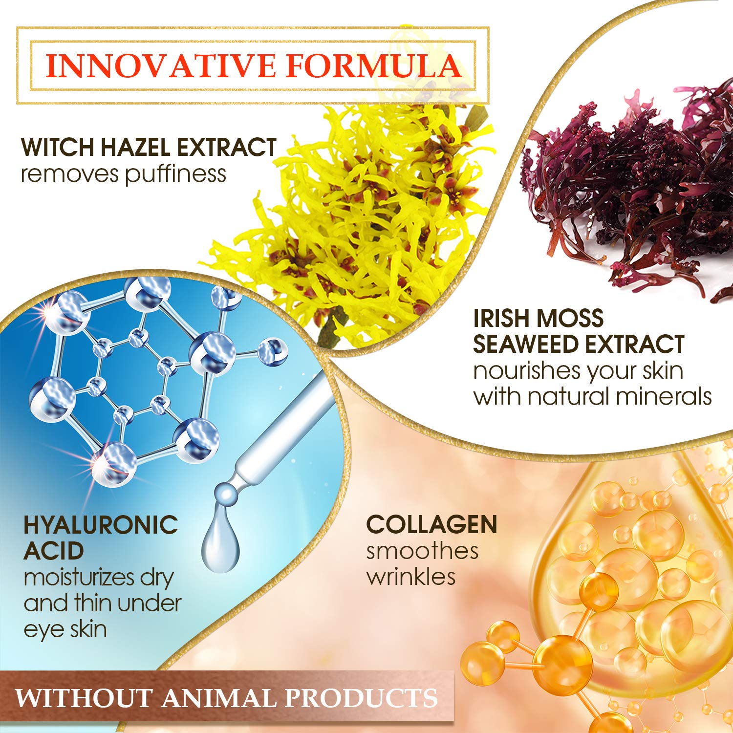 • ULTRA EFFECTIVE - Infused with goodness of witch hazel, Irish moss seaweed, collagen from hydrolyzed wheat protein & hyaluronic acid, the EYE GEL PADS effectively help repair damaged & tired skin