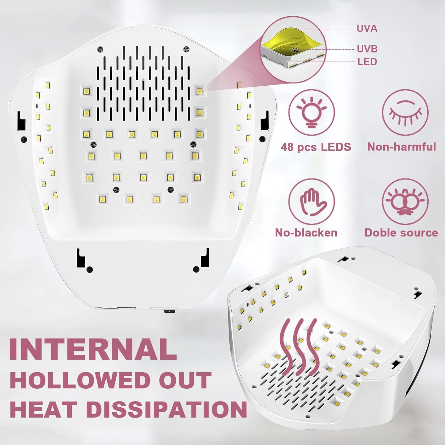 • 96W High Power & Saftey.Powerful 96W nail dryer with 48 Pcs durable and harmless beads shorten your curing time by 50% than normal nail lamp.It is compatible with all gels, non-harmful substances to the human body