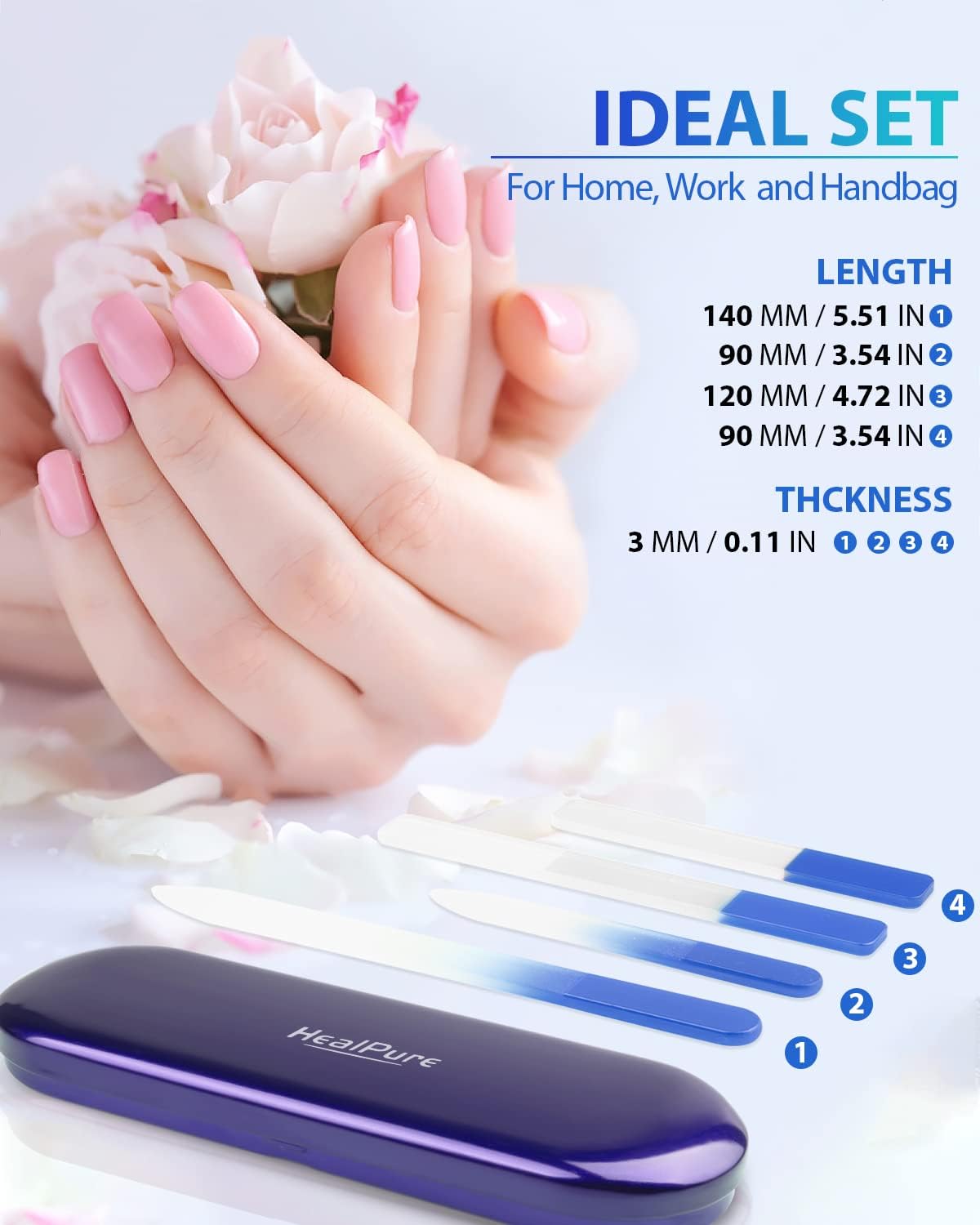 Glass Nail File and Nail Shiner, 4PC Crystal Nail File and Nano Glass Nail Buffer, Premium Set with Case, Professional Manicure Tool Fingernail Czech File for Natural Nail, Gift for Women and Girls