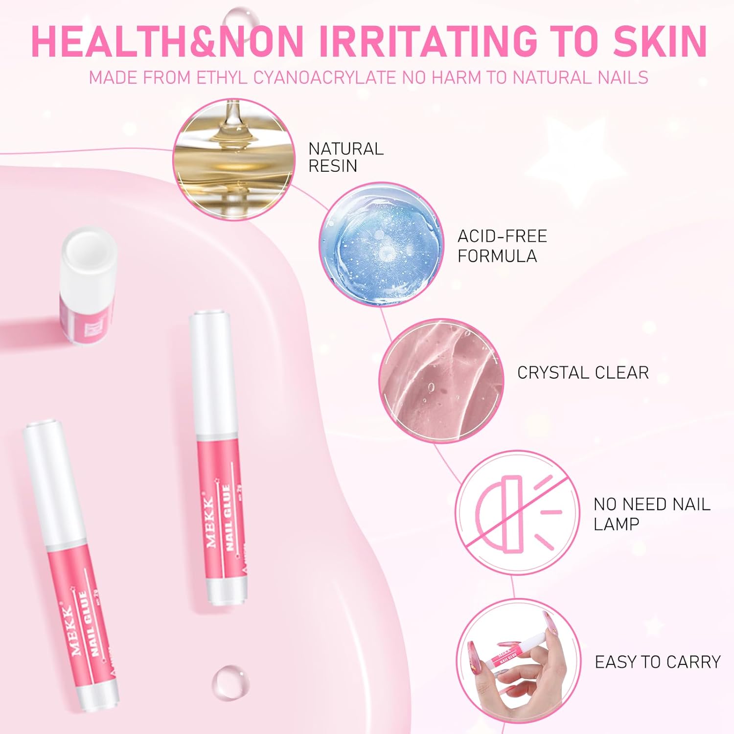 • HEALTHY MATERIAL&WIDELY USES:MEKK nail glue with MSDS certificated, made of natural resin, slight odor, no harm to your natural nails. Our nail glue is perfect for sticking false nails, broken nails and small nail art decorations such as rhinestone, beads & gemstone. MEKK nail glue can bring the salon home.