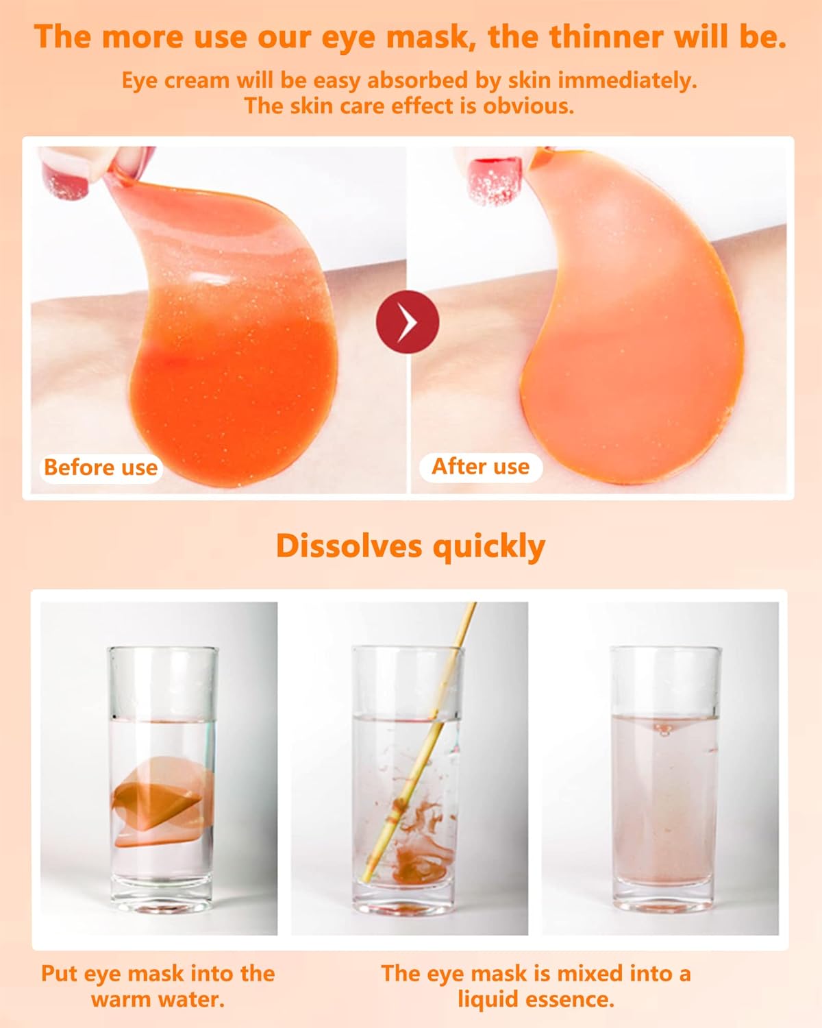- COMPLETE TREATMENT- Can be used around the eyes, neck, forehead and around the mouth area. Dry off water and stick the eye masks,it won't slide down,you can do what you like.After 20-30mins,then remove the eye pads and gently massage the essence into the skin with your fingers. The hydrogel eye patch will become thinner and thinner when using, the nutritional absorption is visible, can deeply nourishes the skin. That will experience in the comforts anytime of your own home and your own time