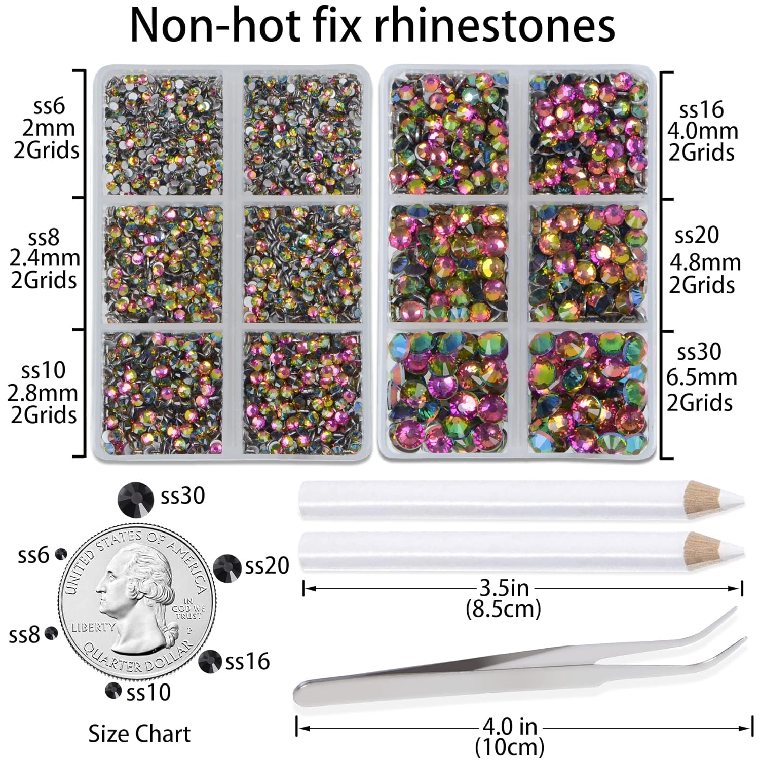 - Approx 6000 pcs of good quality sparkly flatback glass rhinestones with tweezers and 2 picker wax pencils help you easily pick up and set rhinestones in all your jewelry.