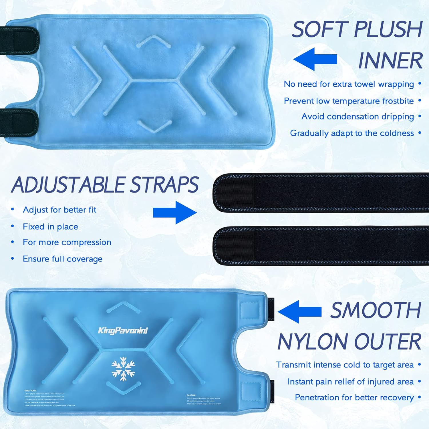 - Plus Size Knee Ice Pack: Measures 19"X10.6" with 24.8" elastic straps, large ice pack ensures a full coverage for your knees, which is available for knee circumference up to 19". Two adjustable straps make gel ice pack more fit your knee and add compression, securing in place to free your hands.