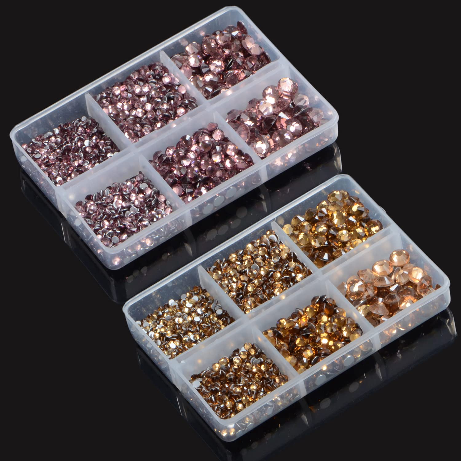 - 6 Sizes charming crystal rhinestones with storage boxes easy to carry, 1.5mm to 6mm. ss6 ss8 ss10 ss16 ss20 and ss30. Rhinestones are not hotfix and require glue to stick them, glue is not included.
