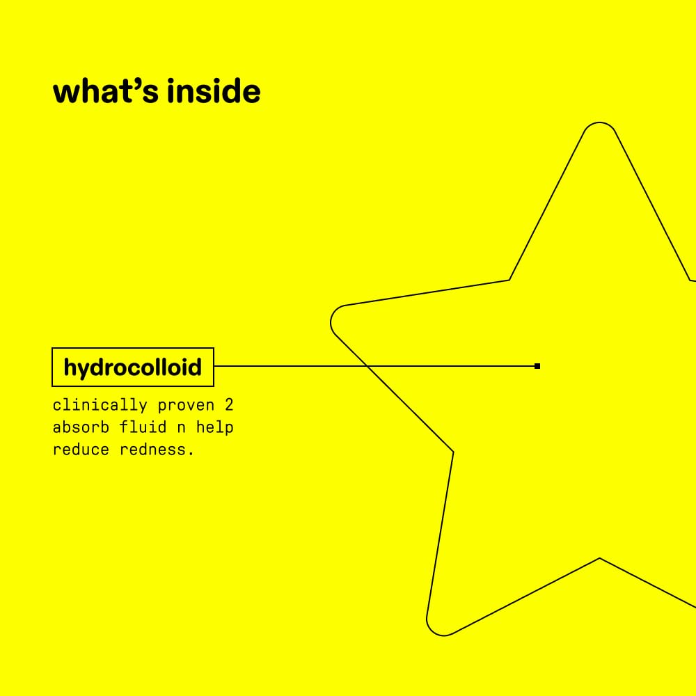 - CUTE & EFFECTIVE: A star-shaped pimple patch that's out of this world. Made with 100% hydrocolloid to help absorb fluid, reduce redness, and shrink spots while looking cute.