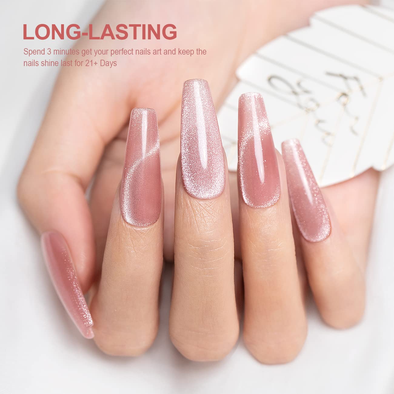 • EASY TO APPLY:This nude color cat eye gel polish is made with with natural resin ingredients,magnetic shimmers,translucent pigments and a smooth formula,so this gel polish set won't cause smudges cracks, or chips.It can last for 21+ days with perfect shine under proper application