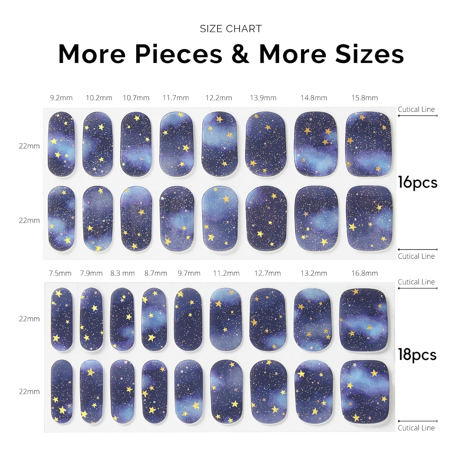 - ă34 PCS NAIL STRIPSăMore Quantity & Sizes than Ever! - With 17 different sizes of our nail art stickers, you can easily find the right size to match your nails. - New curved side line fits even better with your nail shape for seamless adhesion.