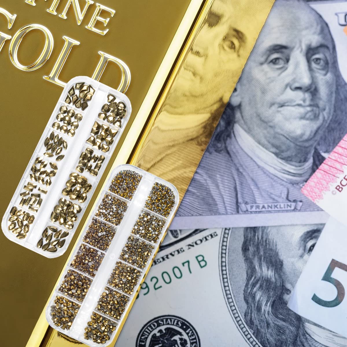 - ❤【Multi-Functions Diamonds Mine Gold Rhinestones & Available Occasions】Metallic Gold nail rhinestones and gems set are very suitable for 3D nail art, flat nail art, Arts & Crafts, DIY slime making, DIY crafting projects, night out, costumes, wedding dress, books, scrapbooks, Christmas decorations, gift-wrap, ornaments, ceramics, greeting cards, signs, face, nails, computer, cell phone case, invitation card and etc.