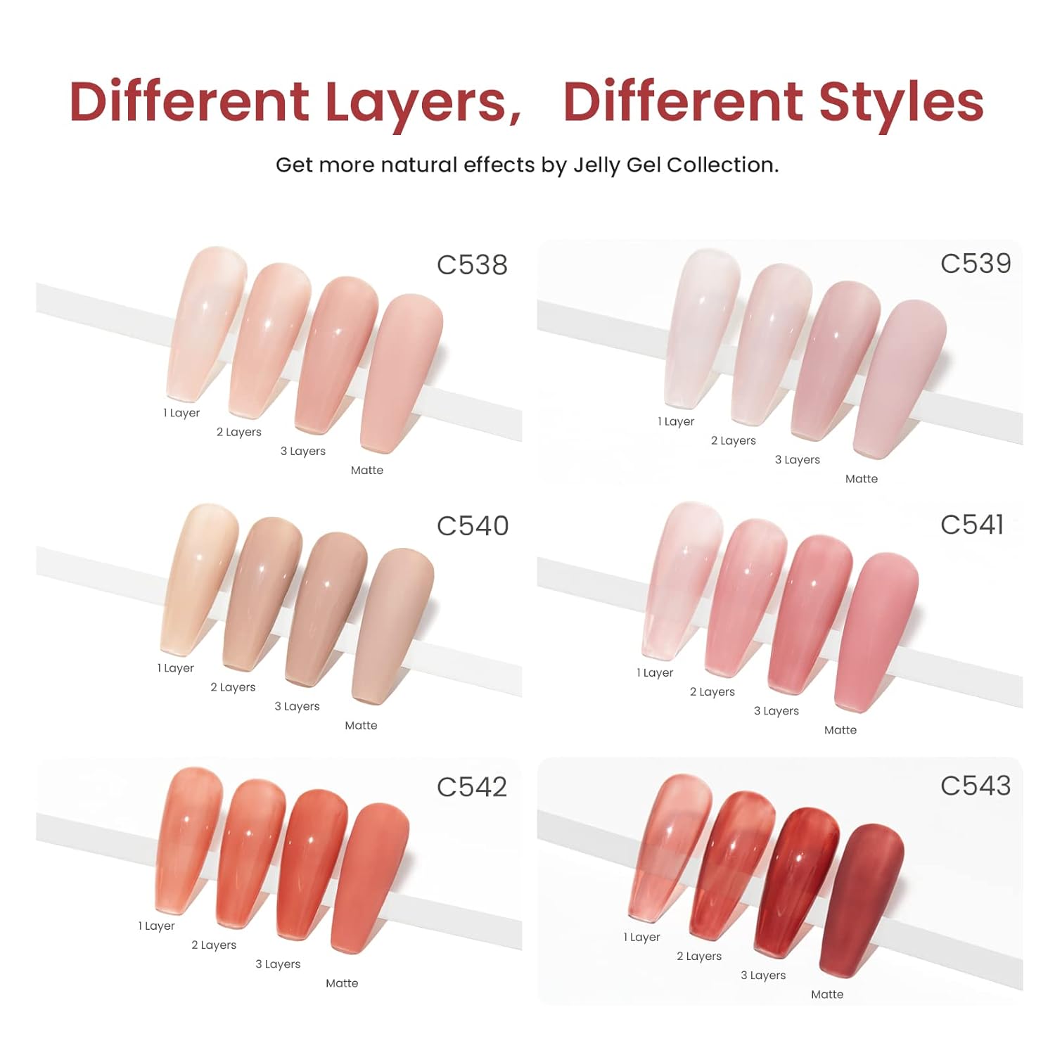 - [Beetles New Arrival]: We put together the top 6 trendiest new colors jelly gel nail polish for this year! We studied the upcoming color trends closely so you could display a colorful, stylish, modern manicure every time for holidays! This transparent jelly color gel is perfect for the nail lover with different skins.These ultimate monochrome nail concealers can be used to make various nail styles, such as french nails and swirl nails. Color Number: c538 C539 C540 C541 C542 C543