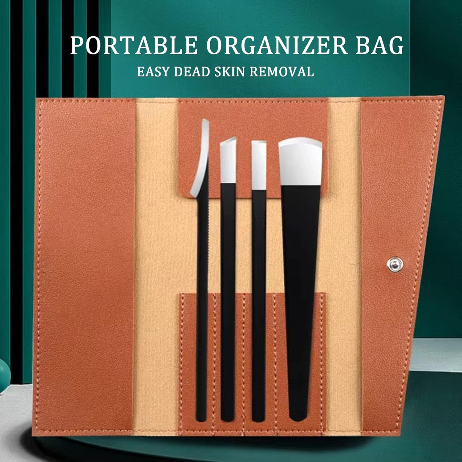 - PEDICURE KNIFE SET : Package include set of 4 pieces foot care tools. Product list: 1*wide blade knife, 1*strip knife, 1*scraping knife, 1* inclined knife, 1*leather bag for storage. Great for paronychia, picking corns, removing cocoons, dead skin, cracked skin, callus and cuticle.