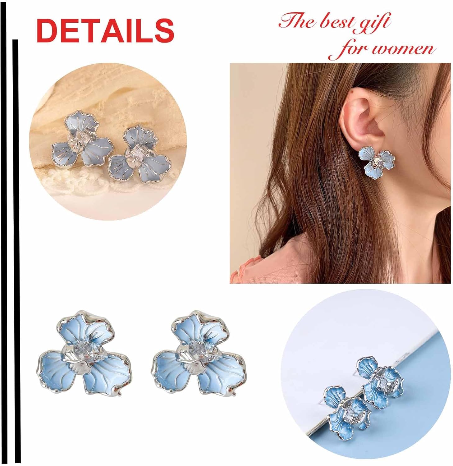 Unique Blue Flower Earrings Studs Vintage Floral Petal Earrings Statement French Blue Iris Flower Earrings Studs Bridal Wedding Prom Earrings Jewelry for Women