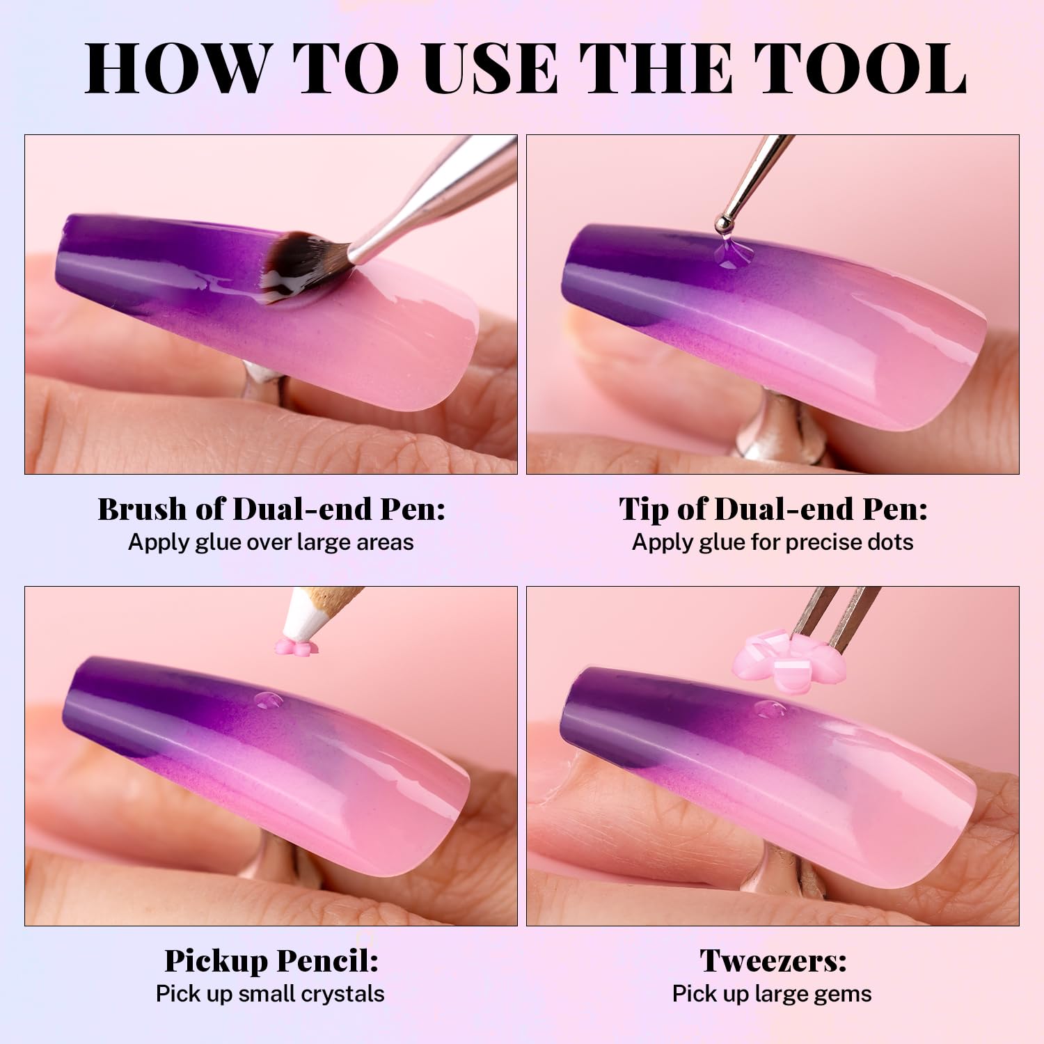 - 💎ADHESIVE GEL GLUE: The crystal clear nail gem glue uses a special, non-toxic and eco-friendly formula with strong tackiness, adhesion, and fluidity for easily applying decorations. It is a type of UV gel glue. After proper curing under a UV/LED lamp, the glue dries clear with superior bonding strength that can last weeks without falling off. With the designed tip, you can easily and conveniently apply the glue to the nail bed or the surface of false nails.