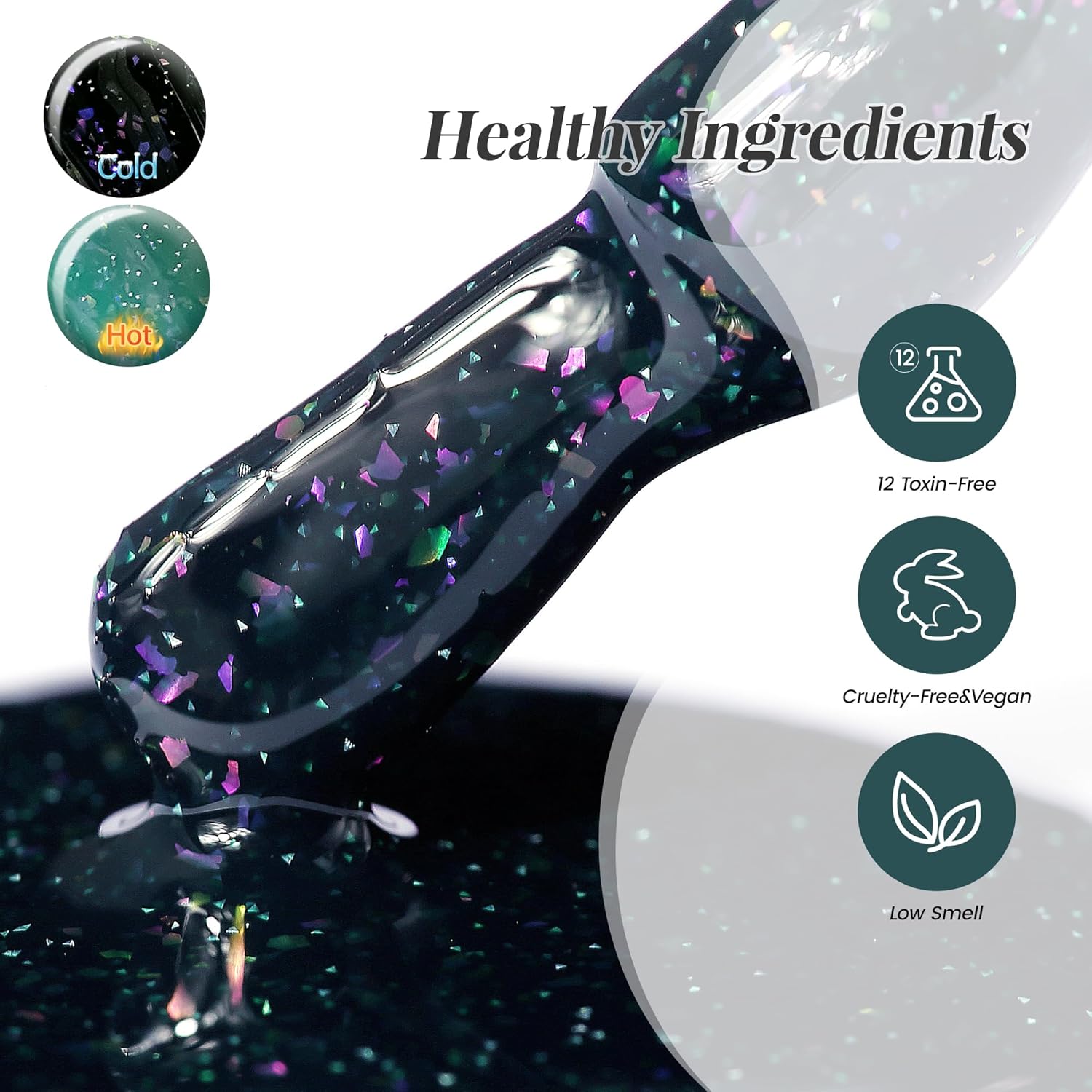 YTD Likomey Brocade Glitter Color Changing Gel Nail Polish,15ml Bright Green To Dark Green Shimmer Mood Temperature Change Colors,Fall Winter Ombre Thermal UV Nail Gel,WB349