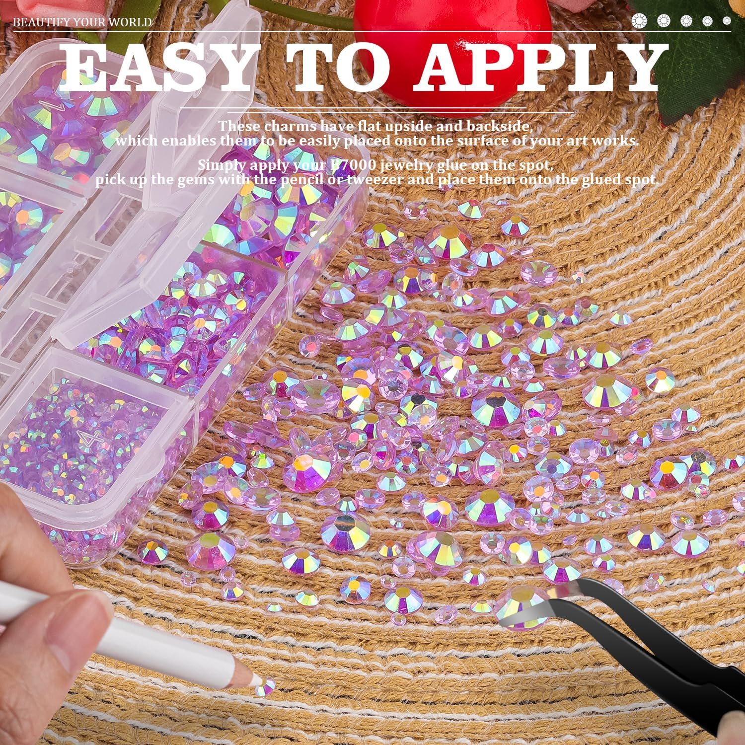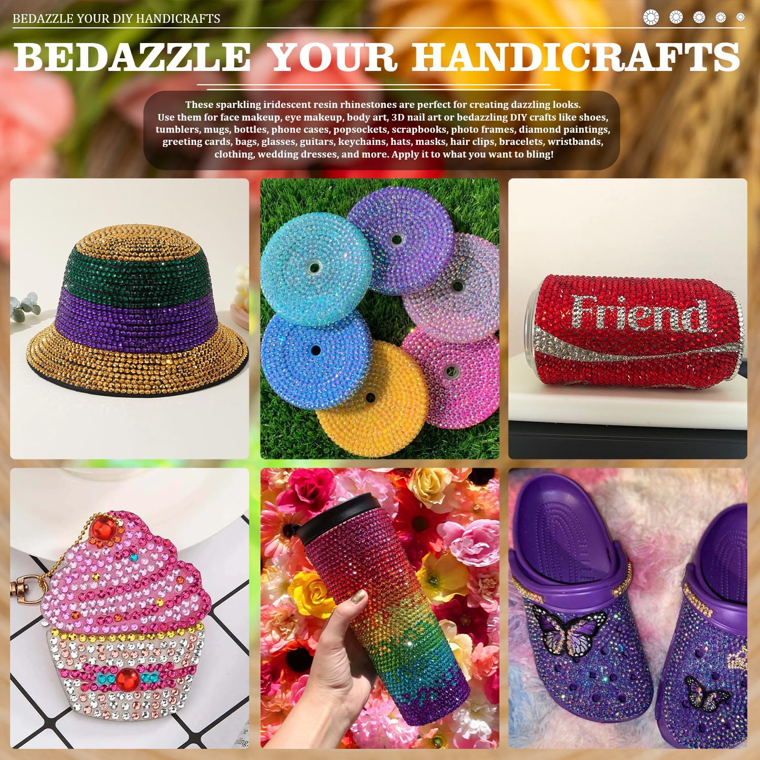 • 💎WIDE APPLICATION -- These sparkling iridescent resin rhinestones are perfect for creating dazzling looks. Use them for face makeup, eye makeup, body art, 3D nail art or bedazzling DIY crafts like shoes, tumblers, mugs, bottles, phone cases, popsockets, scrapbooks, photo frames, diamond paintings, greeting cards, bags, glasses, guitars, keychains, hats, masks, hair clips, bracelets, wristbands, clothing, wedding dresses, and more. Apply it to what you want to bling!