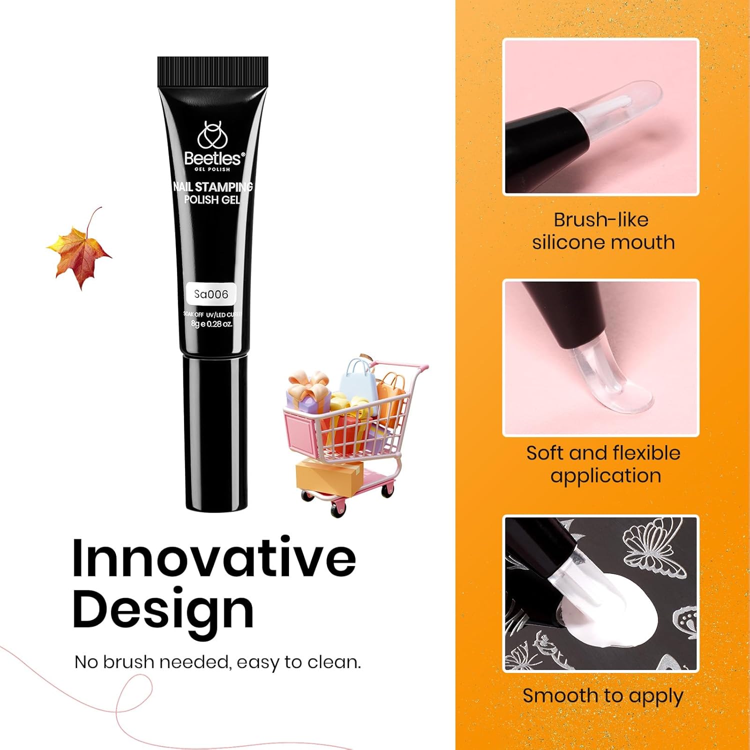 • Beetles Stamp Gel Set: This nail stamp polish gel kit includes nail stamping polish gel 8g*8, Nail stamping template*5, a scraper ,a liquid peel off latex tape 15ml and a short silicone stamper, which is an ideal choice for both beginners and professional nail designers.