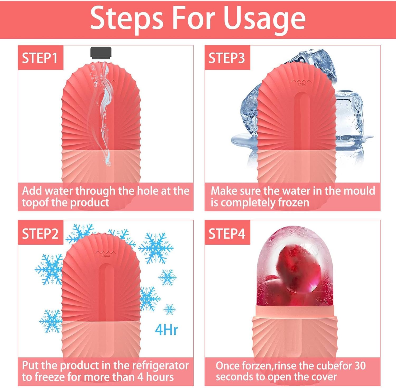 - 💞【Easy to use】 EASY TO USE: Fill the ice roller massager mold with water. Freeze in refrigerator for more than 4 hours,when using it apply the ice to your skin in 30 second intervals in circular motions. For optimal results, It is recommended to use 1 or 2 times a day.