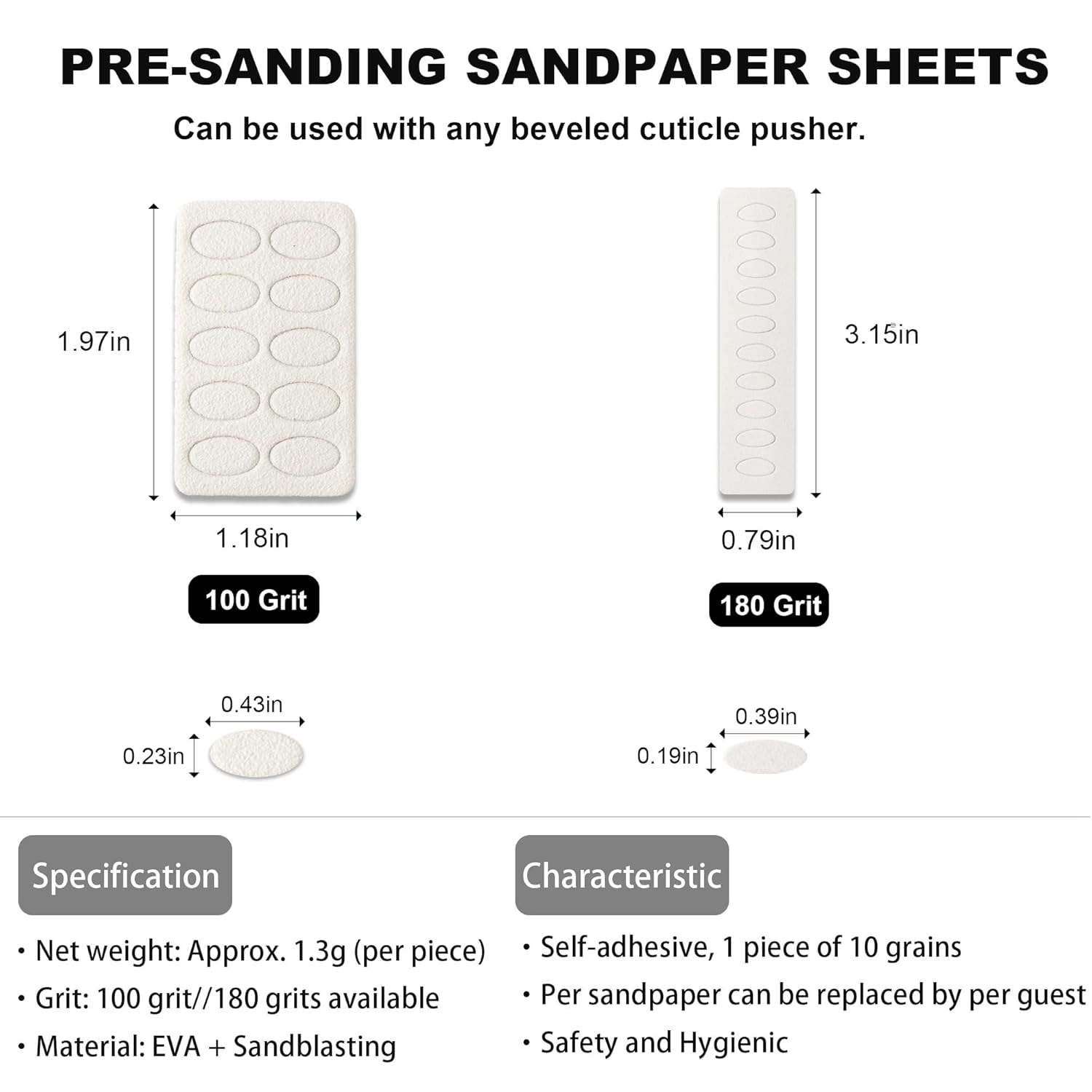 - Efficient Cuticle Care - You will get 1pc double head ultra-thin square cuticle pusher/slant nail pusher and 1pc(10 grains) 100 grit rougher sandpaper, 1pc(10 grains) 180 grit fine sandpaper. It's safe and effective to clean up nail dirt, remove dead skin, file natural nails and so on, without damaging the nail surface and leaving no dead space.