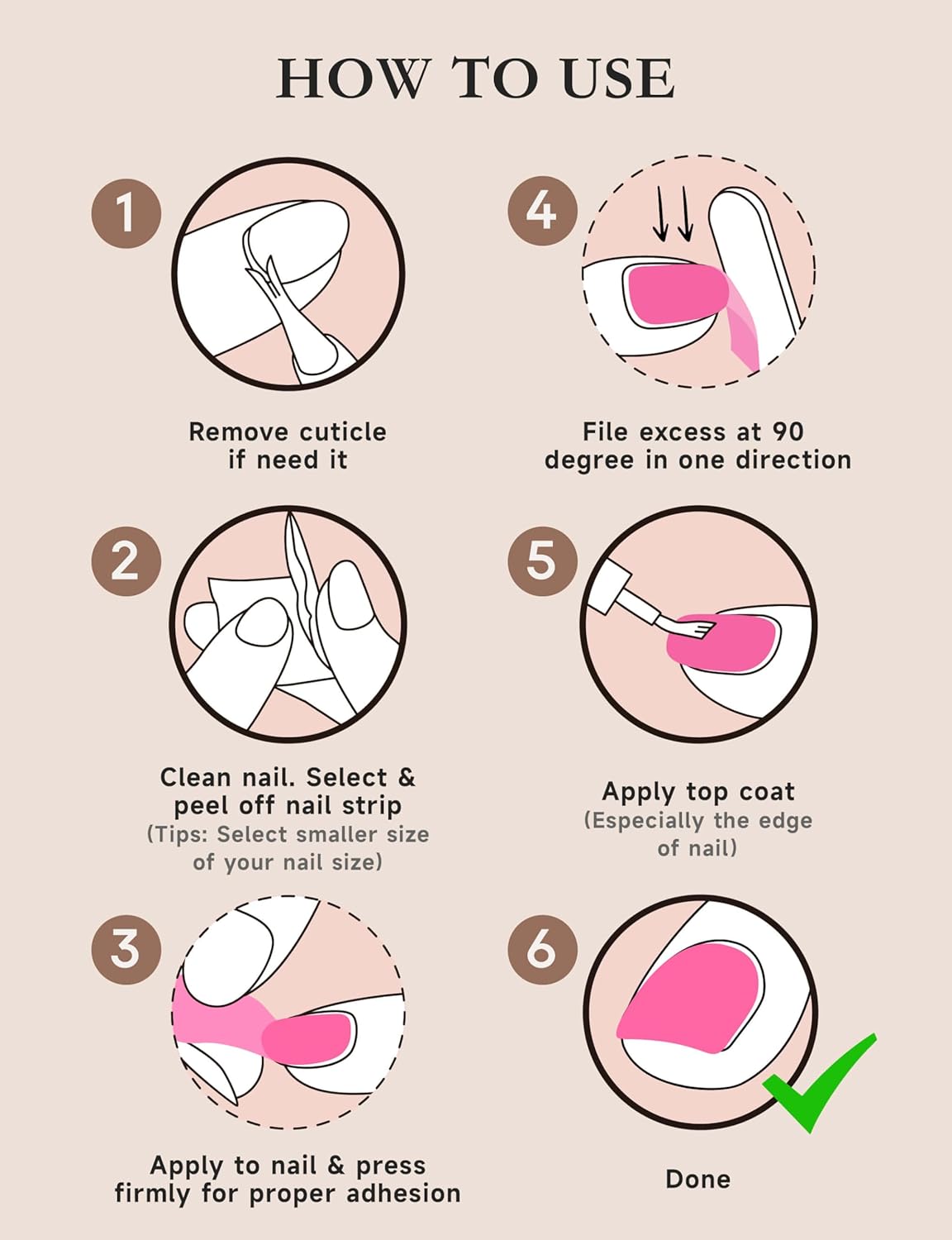- What you get: 44 Gel Nail Strips, 1 top coat, 2 Cleaning Wipes, 1 Wood Stick, 1 Nail File, 1 Cuticle Trimmer. If customers are not satisfied with their purchase or having any problems, please contact us as soon as possible and we will reply within 24 hours with friendly customer service.