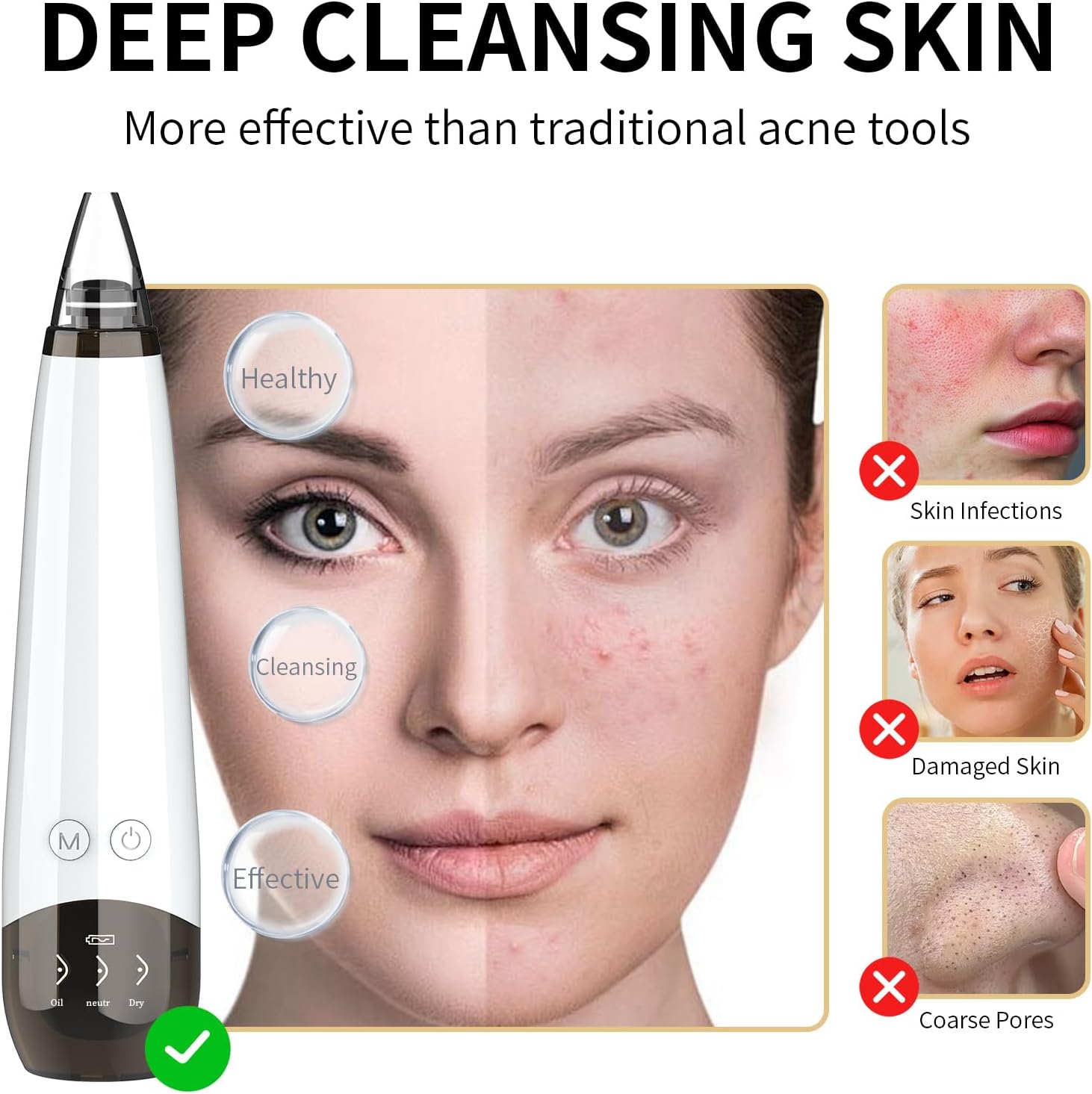 - 【 Blackhead Remover Tools 】Our upgraded blackhead vacuum provides powerful yet gentle deep facial cleansing. It effectively removes blackheads, whiteheads, dead skin, acne,oil and cosmetic aresidue.which can increase blood circulation and skin elasticity, lessen wrinkle, shrink pores, smooth fine lines without hurting your skin.