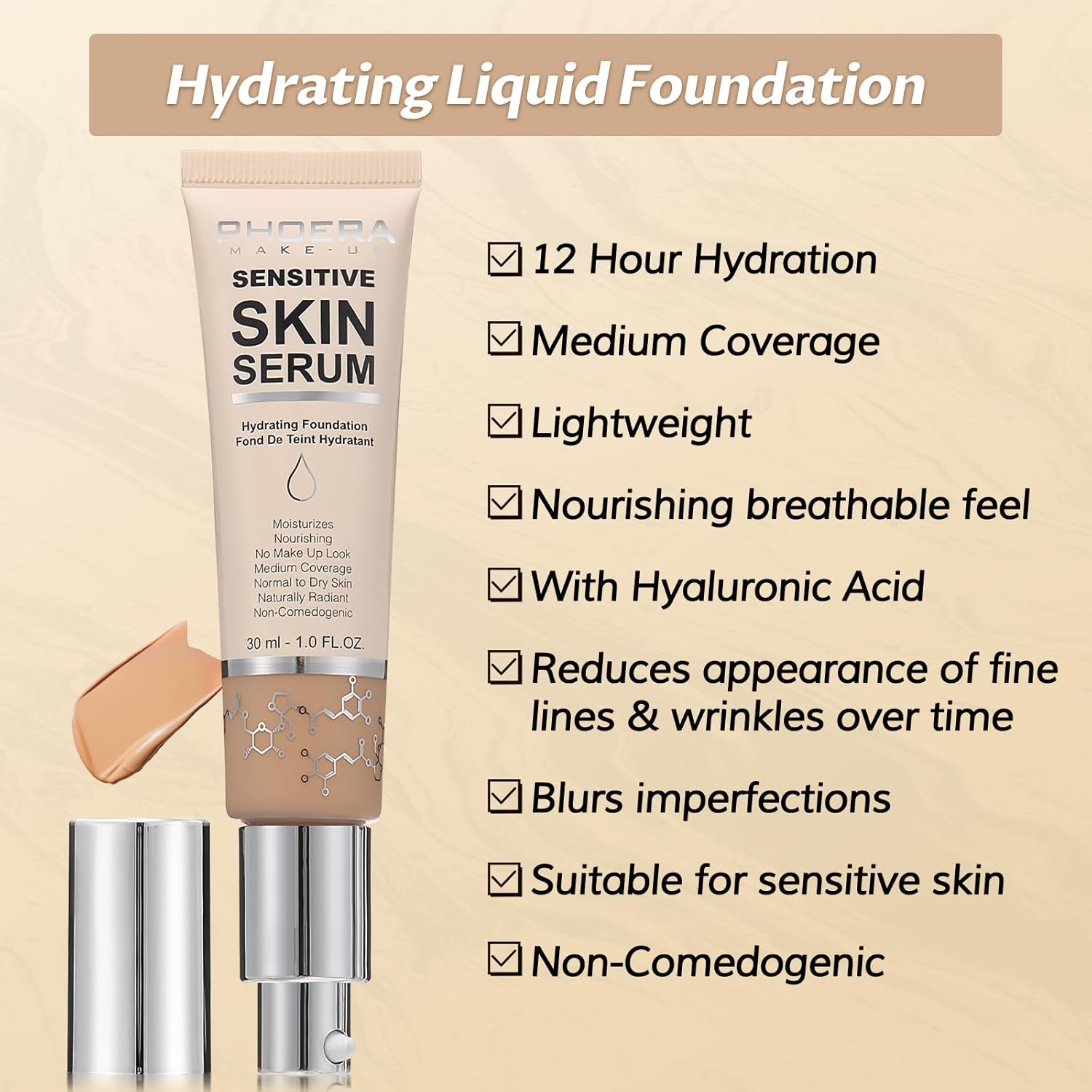 - [Natural Foundation]The serum foundation contains a blend of natural ingredients,which work together to hydrate and nourish the skin.Great for smoothing, illuminating, and minimizing pores prior to cosmetics.A Base for Your Beauty Regimen.