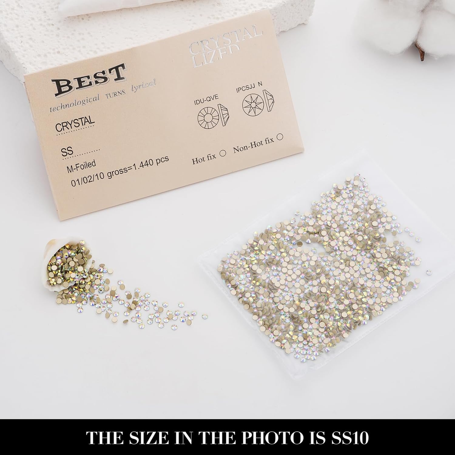 - PACKAGE DETAILS: Pack of 1440 pieces Crystal AB rhinestones SS10, size 2.7-2.9mm.
