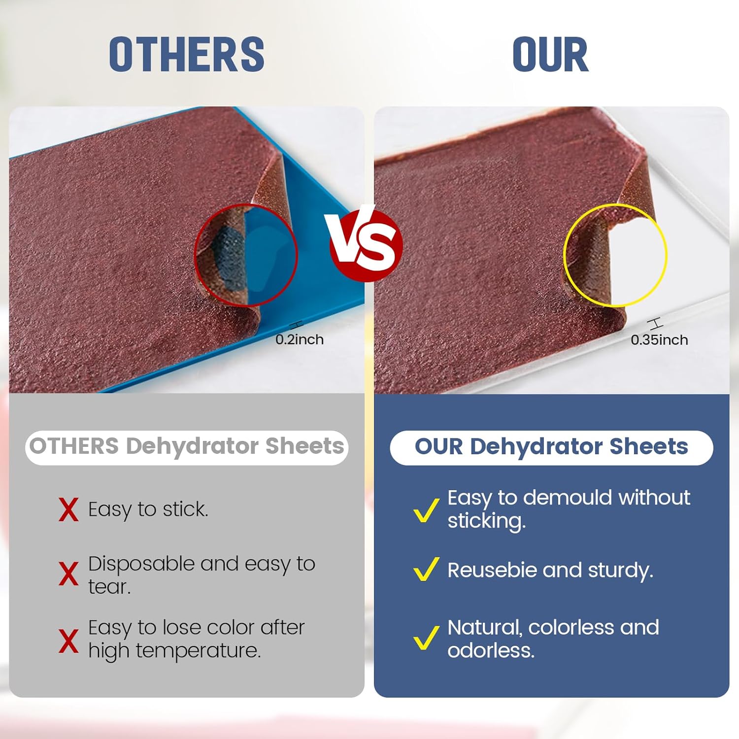 - 【EASY TO CLEAN】These dehydrator silicone trays help keep our dehydrated food from sticking to the shelves.It can be washed at the sink and dishwasher with just regular dish soap and warm water,so much easier than having to wash the dehydrator shelves