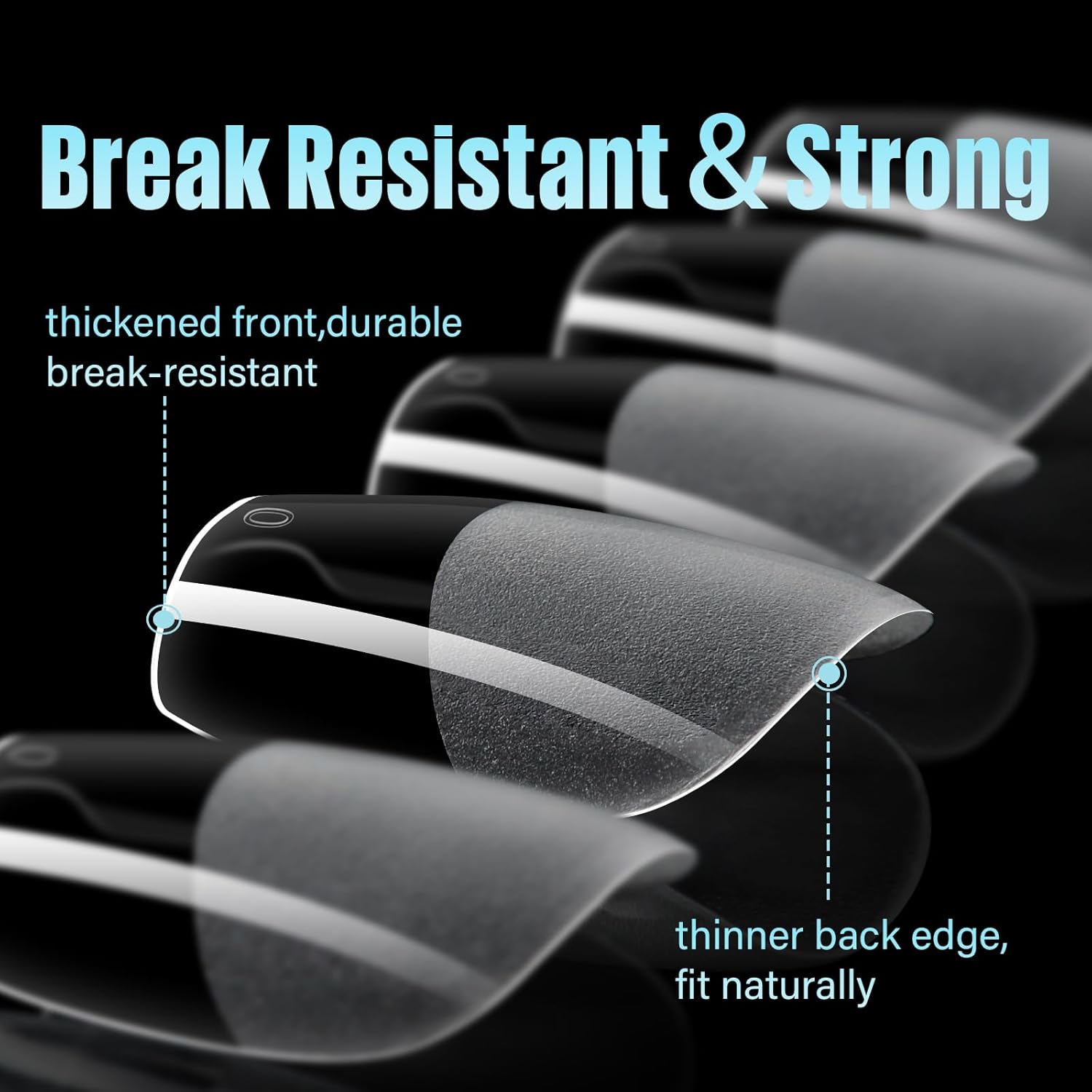 • 【Perfect Fit】 Full cover fake nails adopts a "front edge thick-back edge thin" design. The thickened gel nail tip edge will not crack and lift up at will during use, has a longer service life; the thinner pre-formed nail rear edge can fit the nail better, which will not make you feel uncomfortable. At the same time, The breathability of the nail plate is better, and it will not cause burden and pressure on your fingers.