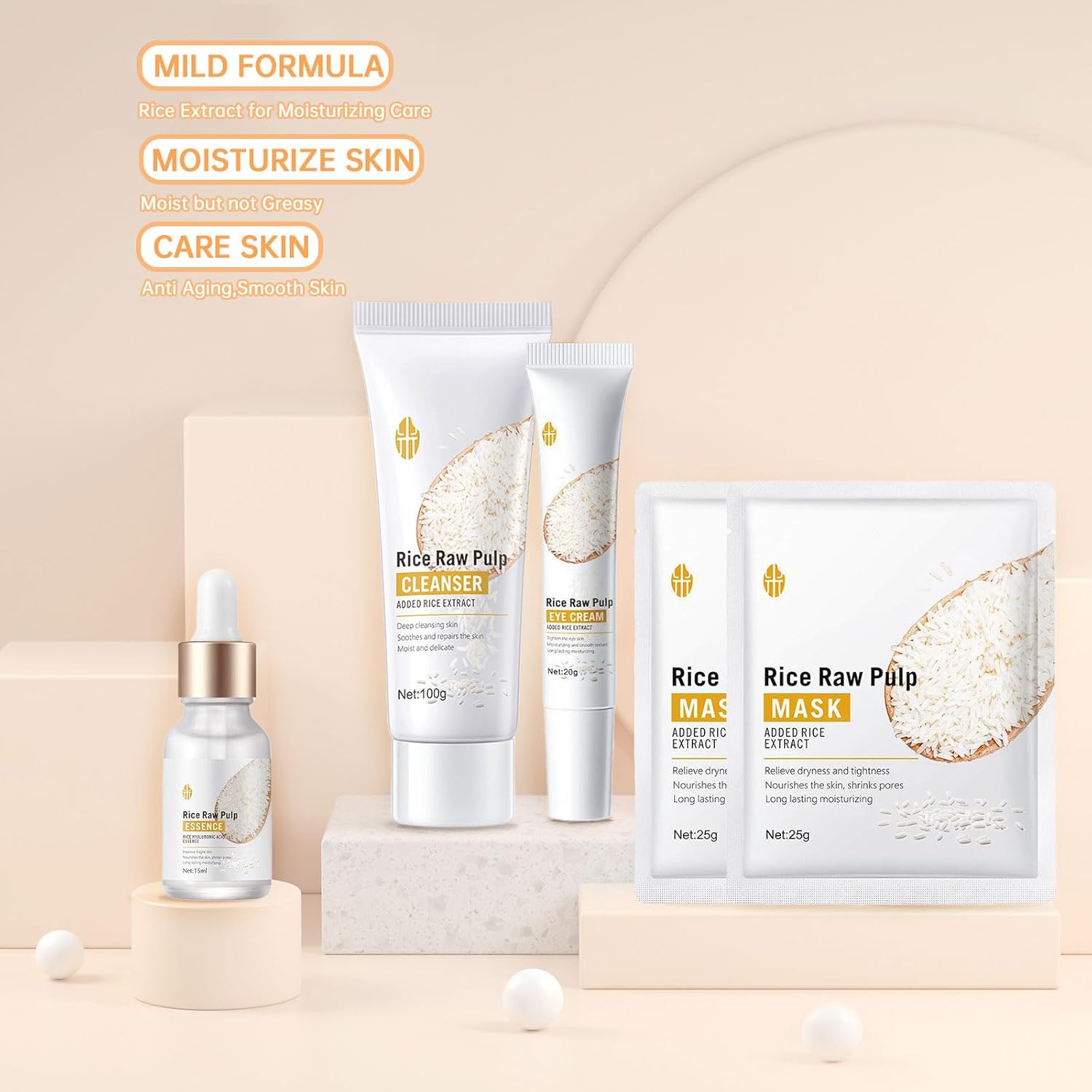 Rice Skin Care Sets For Women, 5/6Pcs Skin Care Kit, Moisturizing Skin Care Gift Set , Face Care Kit Inclusde Rice Mask, Cleanser, Toner, Lotion, Eyecream, Face Serum (5pcs Rice Raw Pulp)