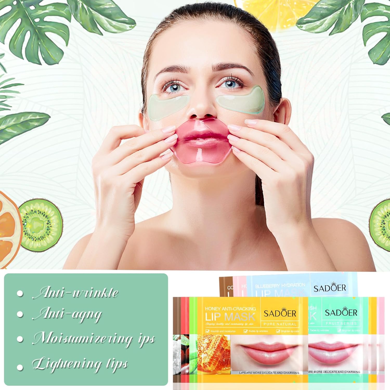 - 60 Pieces Individually Packaged: this product contains 10 lip masks, 6 pieces each, containing nourishing essences of orange, honey, strawberry, avocado, blueberry, aloe vera, coconut, cherry, coffee bean, and peach; Each pair of lip mask is individually packaged to ensure no contamination