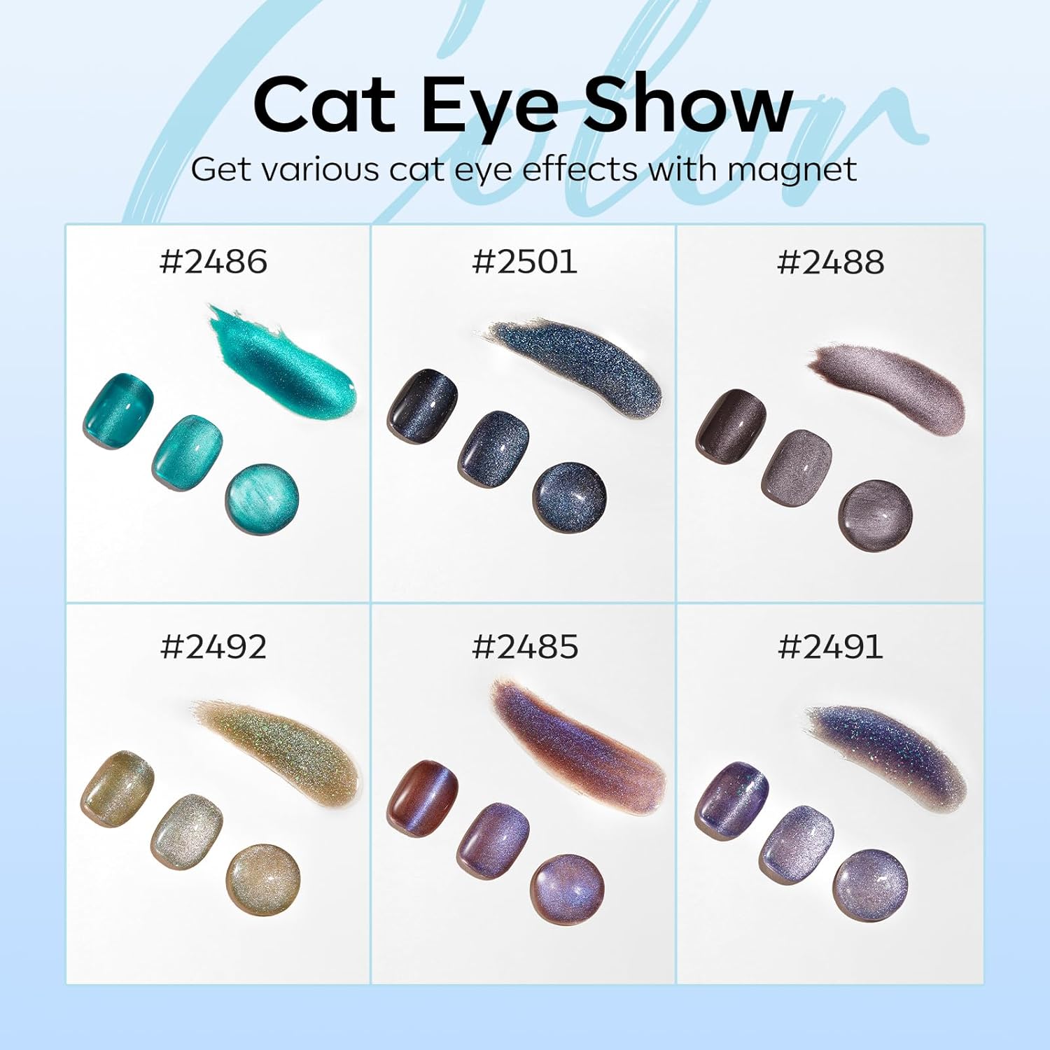• [ What You Get ]: 6 Colors of blue green purple black Holographic Glitter Cat Eye Gel Nail Polish Set (7ml each) + 1 Double-Head Magnetic Stick for various cat eye designs. Practice makes perfect!