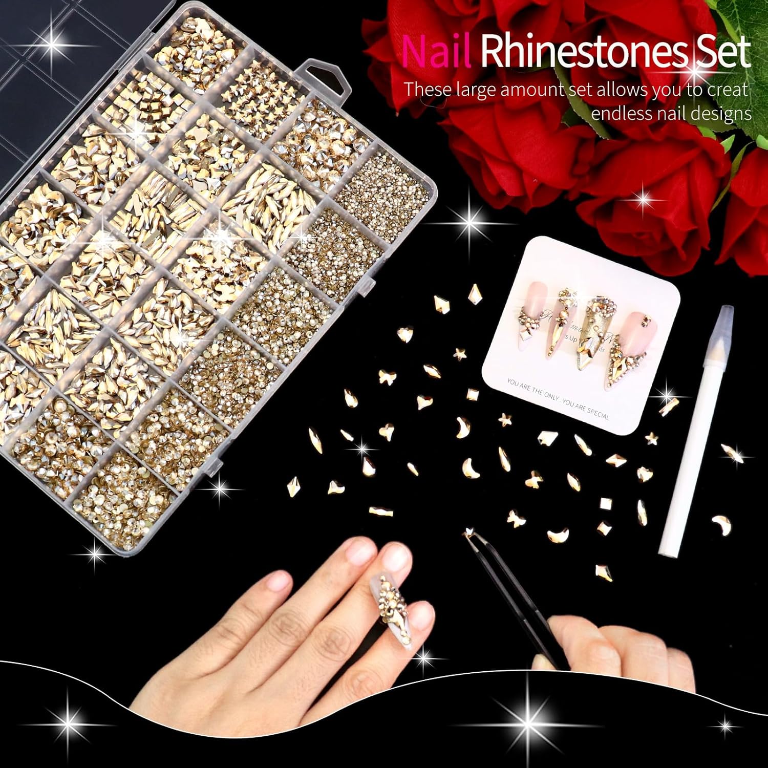 - šŗ You Will Receive: A large box of gold champagne nail crystal rhinestone set, includes 16 styles of 800pcs special-shaped diamond, 50pcs/style; 5200pcs round flatback rhinestones in 8 sizes, with one wax picker pencil and one pair of tweezers.