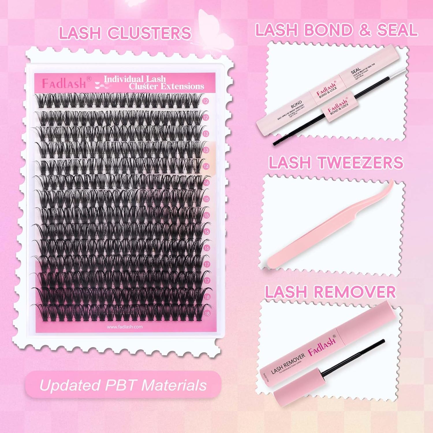 FADLASH Lash Extension DIY Kit Lash Clusters D Curl Cluster Lashes with Lash Bond and Seal Cluster Lashes Glue Remover Lash Tweezers for DIY Eyelash Extension at Home(Kit 50D-0.07D-12-18MIX), black