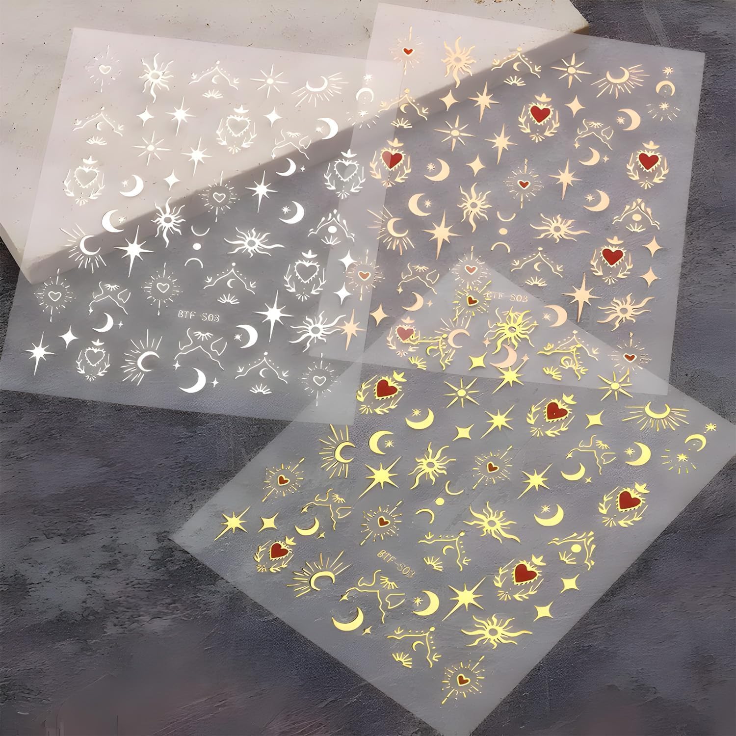 - Package:12 sheets gold sun nail art stickers,more than design patterns.For women kid girls,exquisite nail design DIY fashion nail decoration.