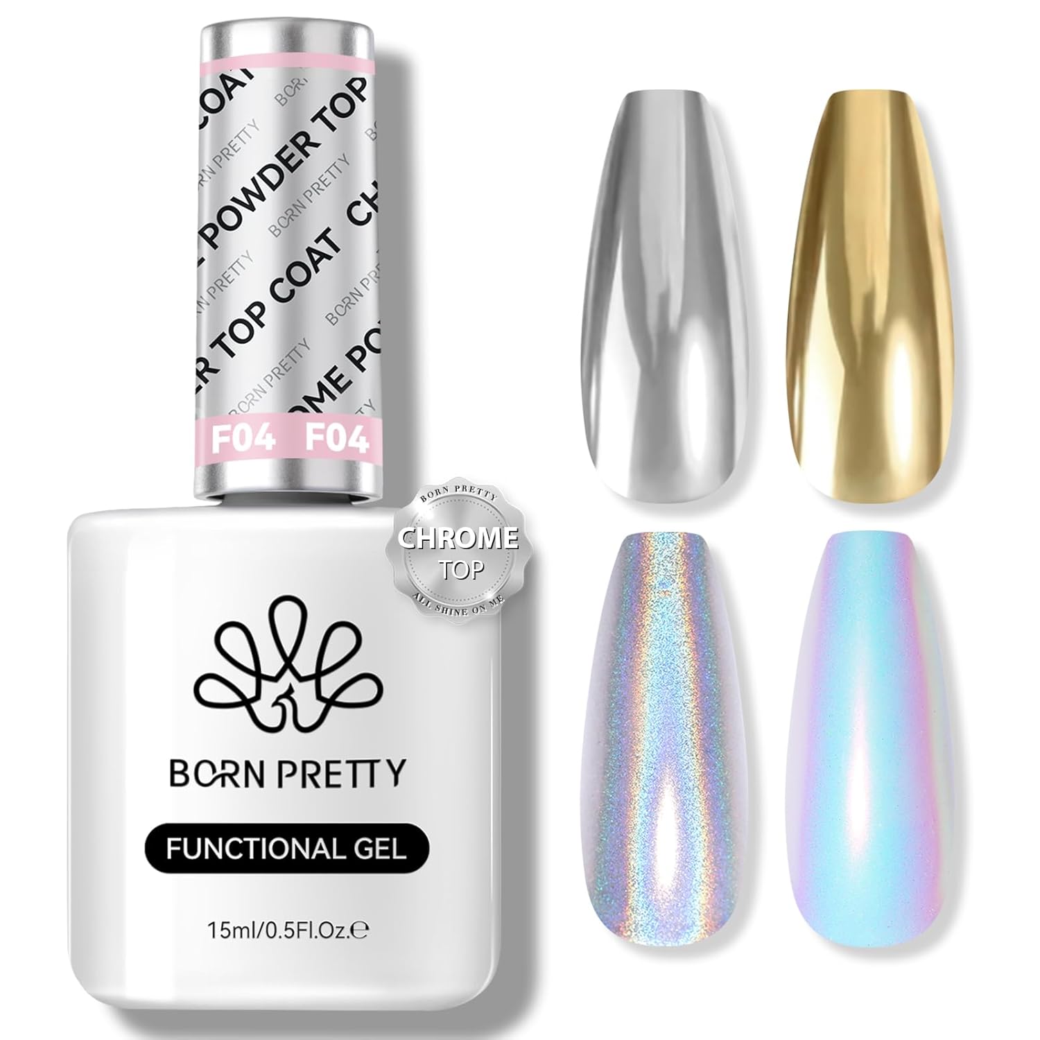 - PACKAGE CONTENTS:1 Bottle 15ml Top Gel Coat for Chrome Nail Powder. This top coat is specially formulated for the effortless application of chrome powder, mermaid powder, or holographic powder, ensuring your nails achieve a dazzling mirror-like shine with ease! Unlike general non-wipe top coats, BORN PRETTY top coat helps you apply chrome powder smoothly, without any graininess or patches.