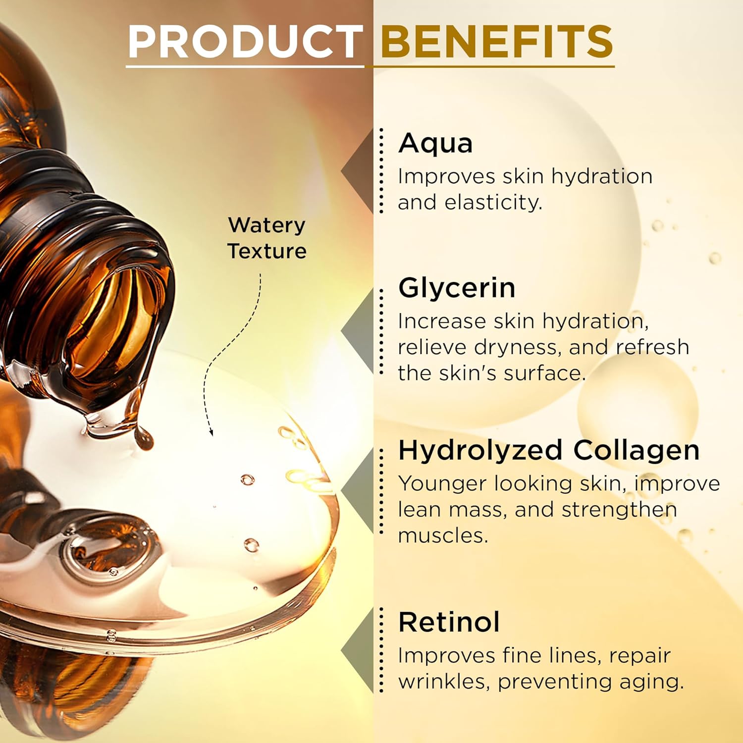 - ✅ 2. POWERFUL & GENTLE FORMULA Formulated with Retinol, Hydrolyzed Collagen, and Hyaluronic Acid, this serum delivers deep hydration without irritation. Perfect for all skin types — even sensitive.