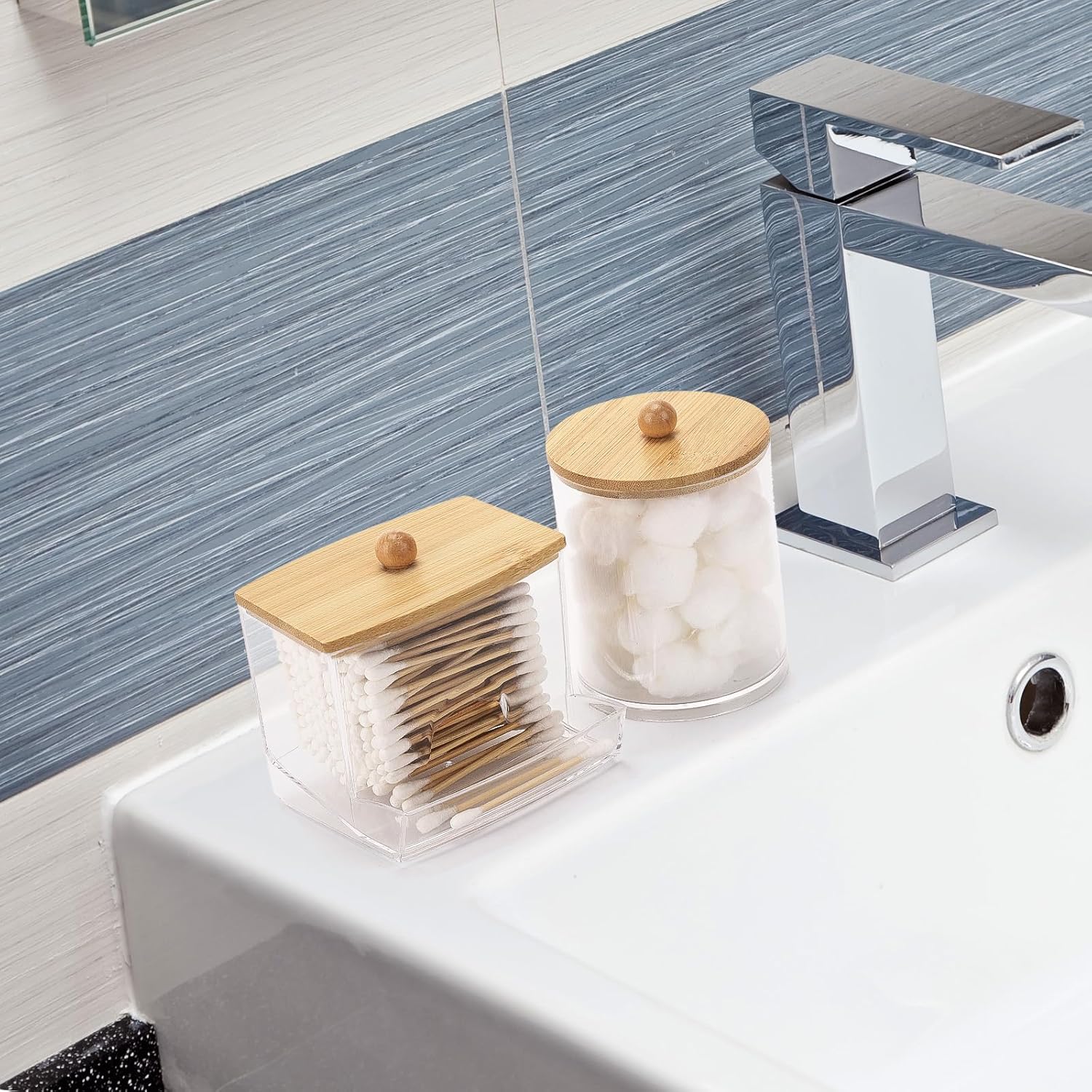 Tbestmax Qtips Dispenser, 10/12 oz Big Cotton Ball Holder Bathroom Container - Plastic Apothecary Jar Organizer for Storage Swabs, Rounds, Floss Picks - Bamboo Lids