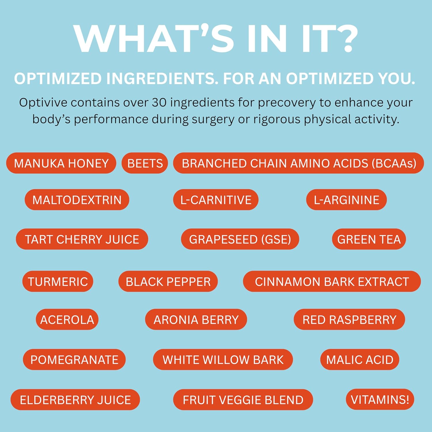 - How Optivive Helps - It contains the rapidly absorbed sugar Maltodextrin and eight energy-generating ingredients, providing the body with an immediate fuel source to burn during surgery. This leaves the reserve stores, which usually are burned during surgery, available for post-operative needs. By loading up with it prior to surgery or procedures, these agents are ready to work for you