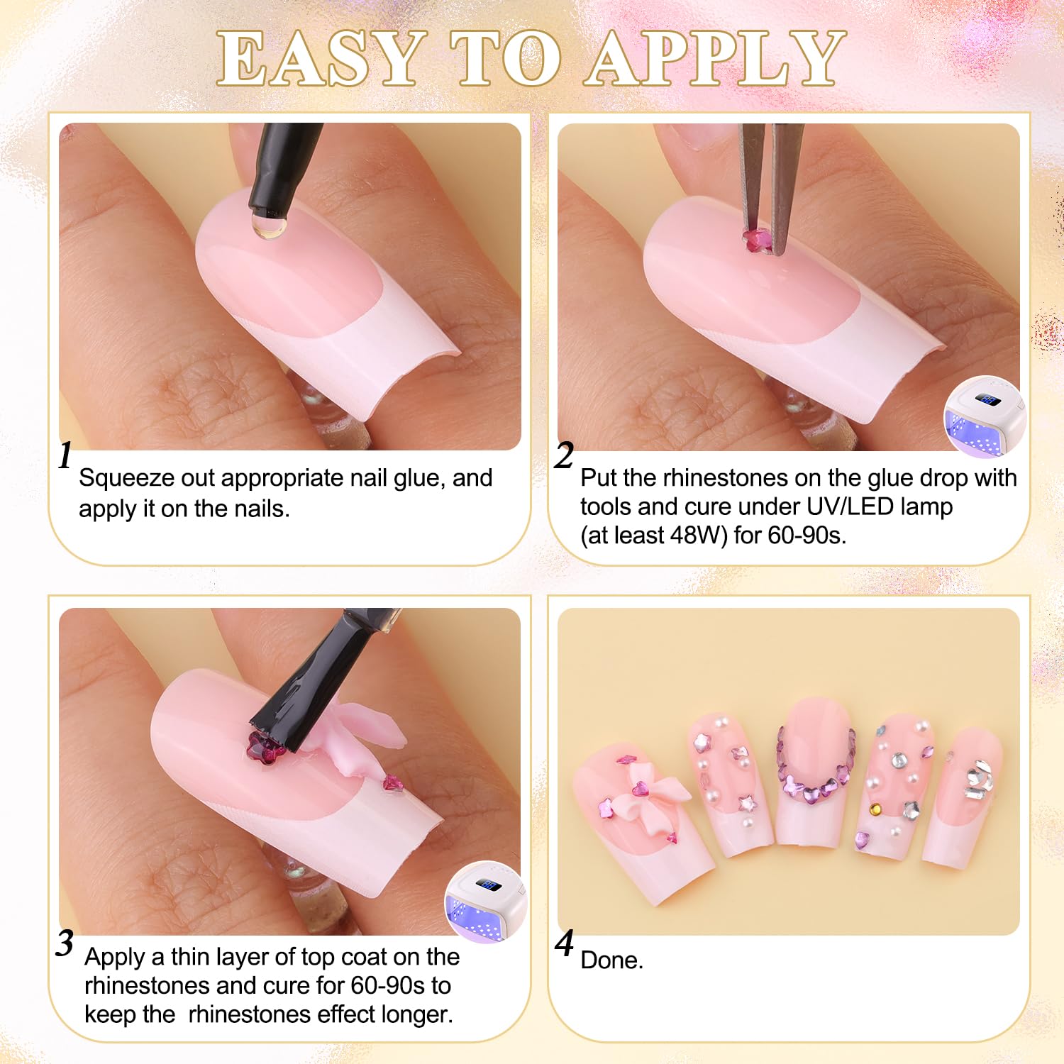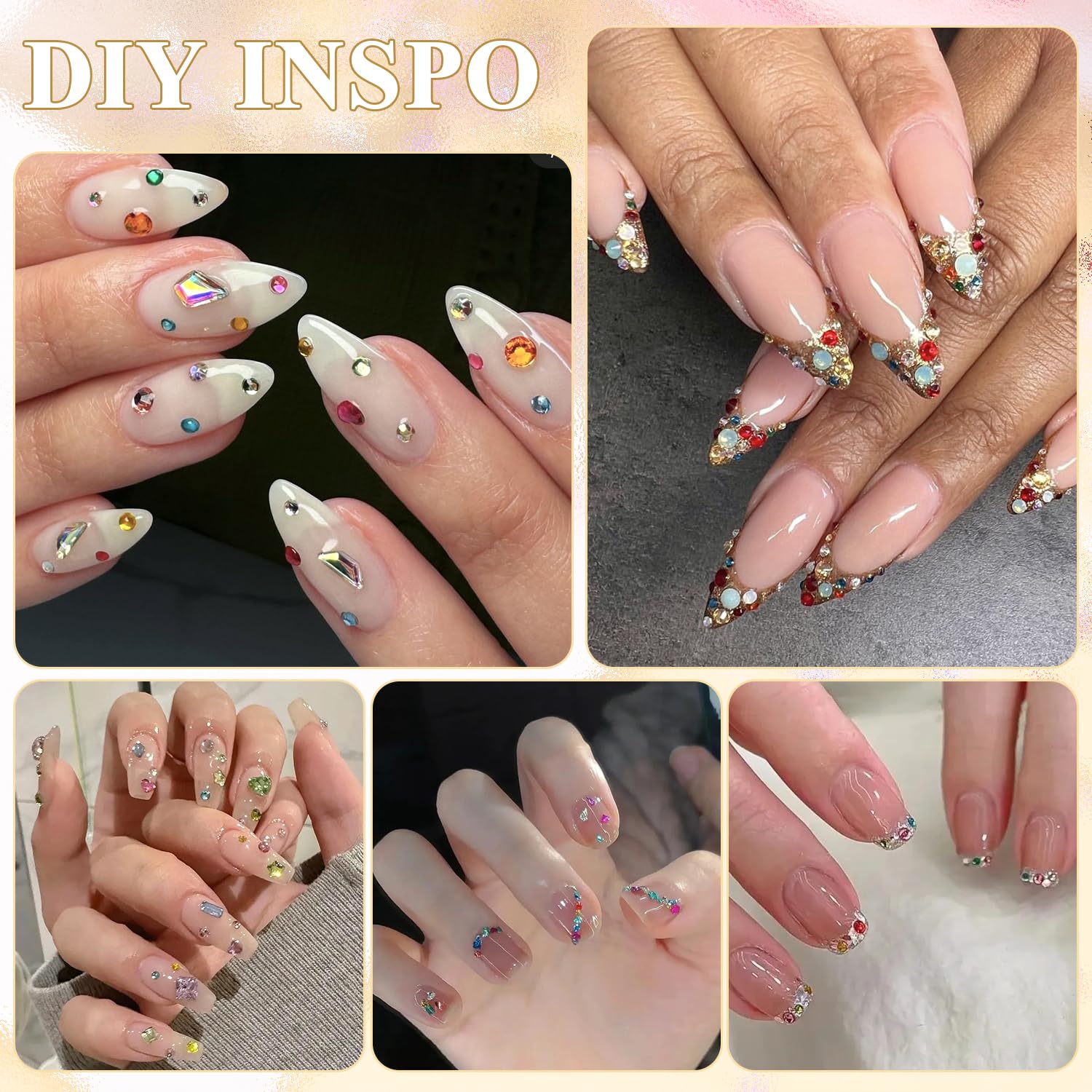 - Multiple Shapes & Colors -- All shapes include heart, butterfly, star, bow, flower, moon, teardrop, diamond, rectangle, square and triangle; Multi-colors include white, red, blue, pink, purple, yellow and emerald. Assorted styles create bedazzling nail