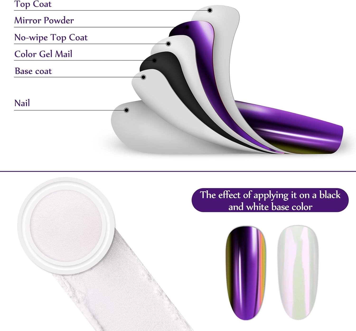 - 【PACKAGE CONTENTS】:16 pcs(each 1gram) Artdone Chrome Nail Powder, 2 for white based pearl nail pigment powders, 6 for Aurora chrome nail powder, 7 for mirror chrome powder, and 1 sliver holographic nail powder. They needs to be used with gel nail polish and no wipe top coat.