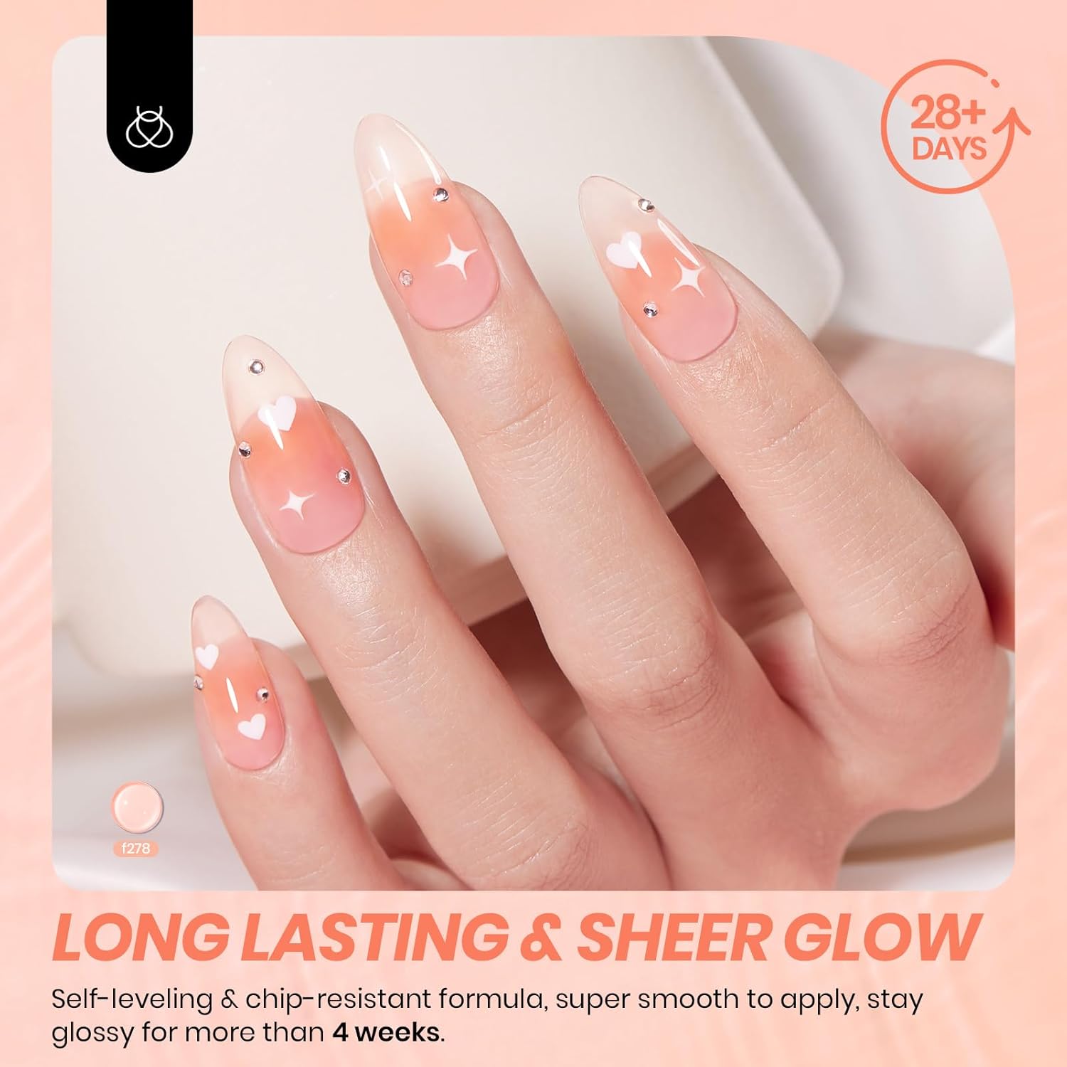 • 【Orange Jelly Sheer Gel 】Apply several layers to build up the color from clear translucent to solid opaque. Each layer, whether one, two, or three layers, creates a different effect. This nude color jelly gel polish is UV gel and need to be cured 60-120s. (Note: It must be used with a base coat and top coat, which are not included and need to be purchased separately)